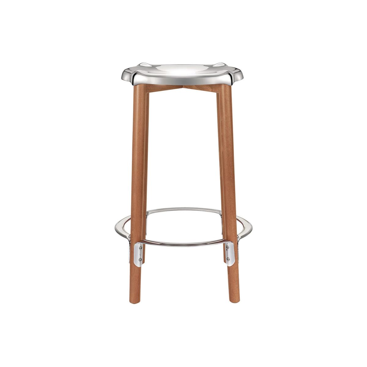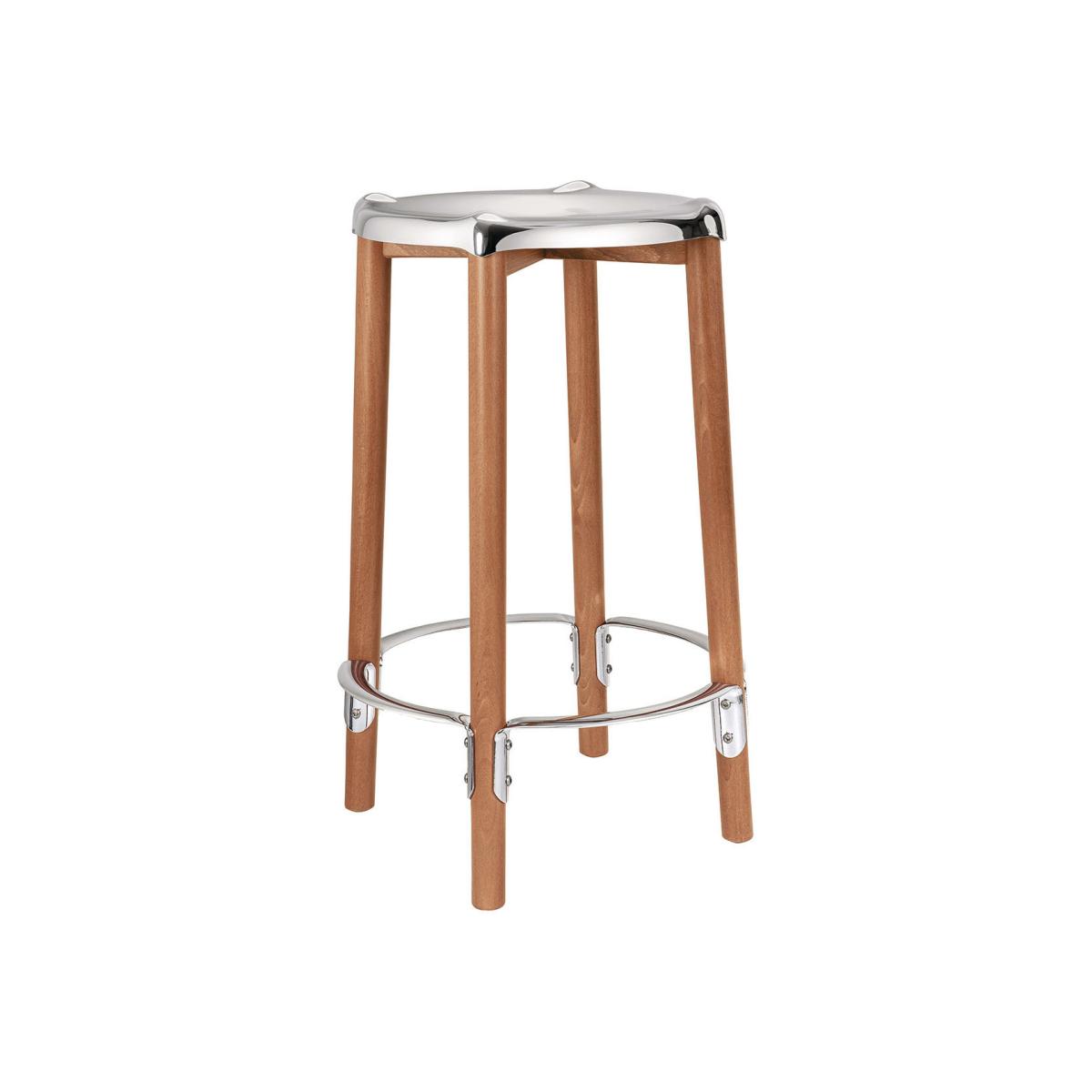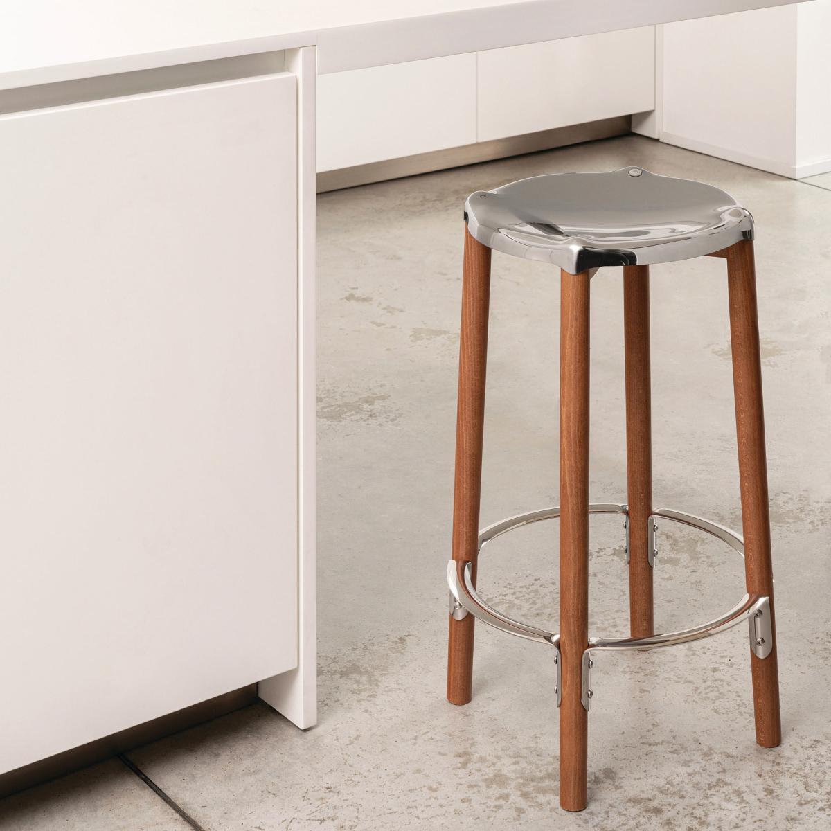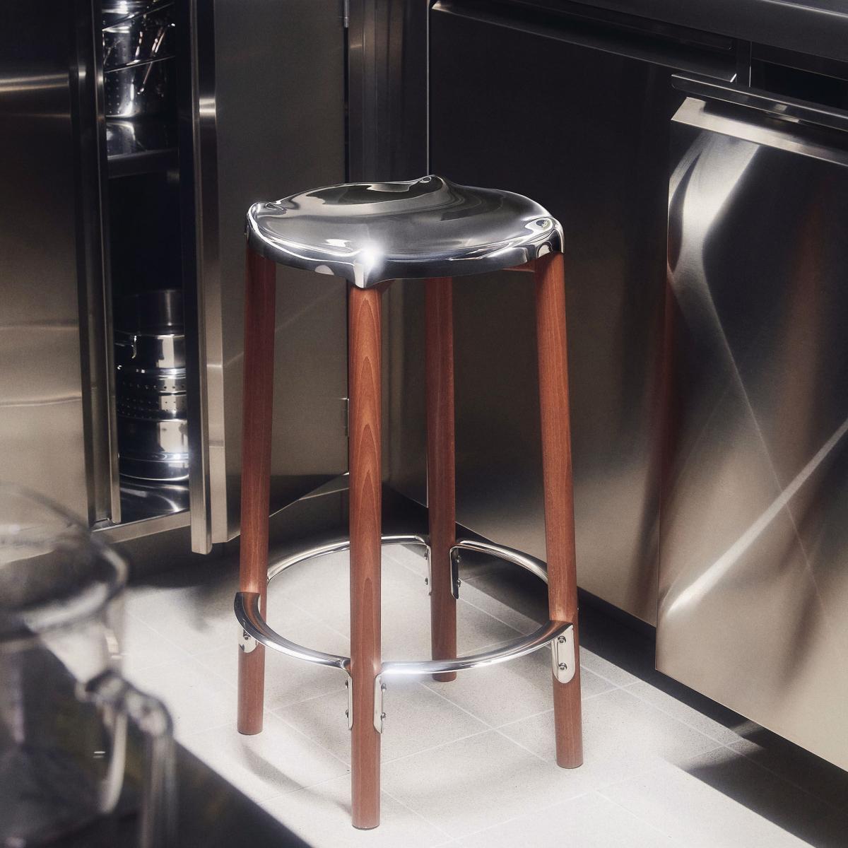 To launch its first furniture collection, Alessi called on the “pope of design”: Philippe Starck. The “Poêle” collection combines the limitless creativity of Starck with the historic know-how of Alessi in working with steel. This project was born from the subversive and humorous idea of designing a chair inspired by a frying pan, both from a manufacturing and aesthetic point of view. Cold-pressed metal technology, traditionally used by Alessi since the 1950s to produce kitchenware, has been reimagined to create a collection of chairs, stools and coat racks. For Alberto Alessi, who has run the company since 1970, it’s about celebrating 100 years of working with metal and more than 30 years of collaboration with Philippe Starck, whom he considers a prodigious visionary. Alberto Alessi: “I’ve been trying to make a chair with Philippe Starck for about twenty years, and finally, we’ve created it. I asked him if it was possible to design a chair that was made like a frying pan, using Alessi's high-tech cold-pressed metal. And, as is always the case with Starck, it started with a repurposing.’’ Philippe Starck: “The starting point of the Poêle (Pan) chair was a very serious joke, with a sketch of a pan with legs and the excellent idea of adapting existing high technology for different purposes. The seat and back are inspired by a frying pan, the feet making up the handles. The Poêle chair elegantly embodies the finest proof of human intelligence: humour and technology. Exactly like my relationship with Alberto and Alessi.'' In its literal reference to the "frying pan", this collection pays homage to the identity of Alessi, which has been manufacturing table and kitchen utensils of the highest quality for more than a century. “Poêle Collection” explores the expressive potential of metalwork through the vision of Philippe Starck. The result is a family of small furnishings where the metal element acquires a surprisingly fluid materiality, enveloping the wooden elements with an unexpected harmony. Wood and steel: two opposing materials that combine perfectly for a high-end effect. Combining tradition and innovation, industry and craftsmanship, these exceptional pieces are made in Italy. They illustrate the exceptional know-how of Alessi’s metallurgical artisans. Possessing a strong contemporary identity, this collection is sure to become a new classic of rooted, enduring design. A collection capable of integrating into all spaces, at home and in the office or in high-end hotel projects.
