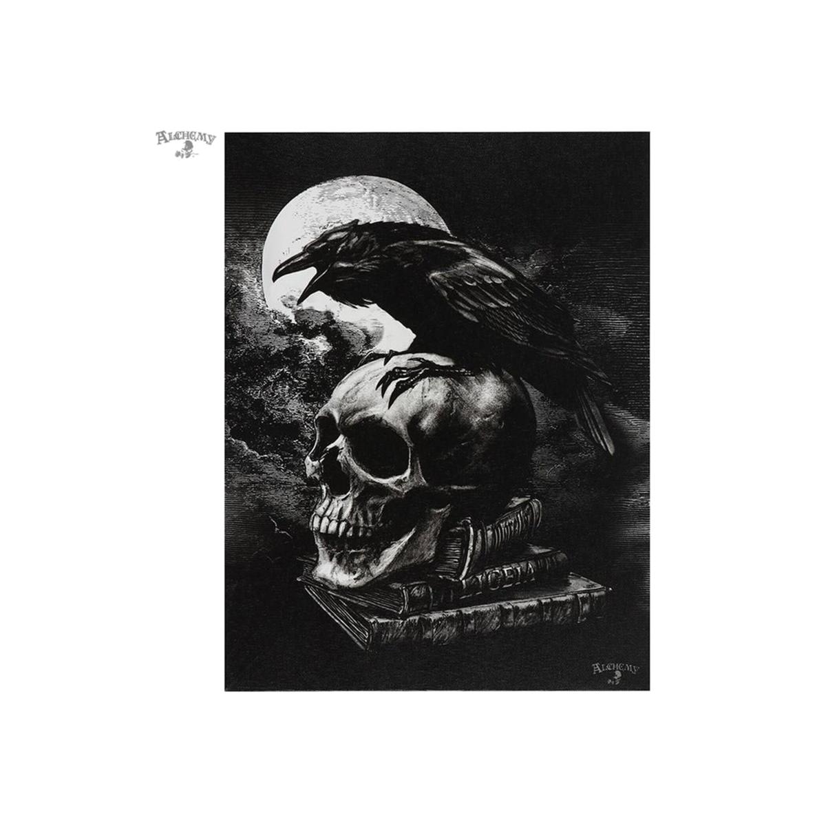 This small canvas plaque features 'Poe's Raven' artwork by the popular Alchemy Gothic of London. A detailed raven sits atop a skull and pile of old books in this stunning, greyscale piece. 19x25cm. The digital watermark will not appear in the print design.