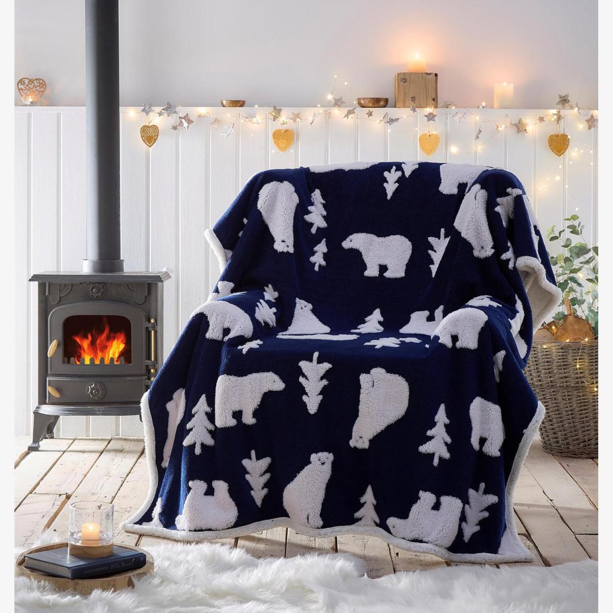This charming and cosy throw blanket brings warmth and whimsy to your home with its delightful polar bear design. Featuring a playful pattern of fluffy, woolly white polar bear scattered across a coloured background, this throw is perfect for adding a touch of woodland charm to your dcor. The polar bear are detailed with a cosy, textured look, making them stand out against the smooth, plush fabric. Made from ultra-soft, high-quality material, this blanket is ideal for snuggling up during chilly nights or simply adding a fun, inviting touch to any room. Whether draped over a sofa or an armchair, the adorable polar bear motif will bring a comforting, pastoral vibe to your space, making it perfect for both rustic and modern homes. Material composition 100 polyester. Care instructions Machine washable. Available sizes 130x170cm