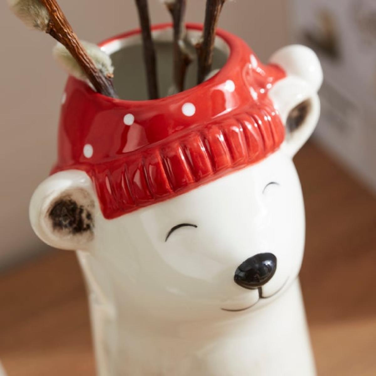 * Adorable polar bear * Cute red hat * Durable ceramic * Lovely wintery touch * Great gift idea Add a cheerful wintery accent to your home with this adorable polar bear vase. Featuring a cute red hat and a friendly expression, it’s sure to bring a smile to anyone’s face. Made from durable ceramic, it’s perfect for displaying festive blooms or seasonal foliage, and adds a cosy touch to any room during the colder months. This little polar bear would make a delightful gift for someone who loves a seasonal touch.