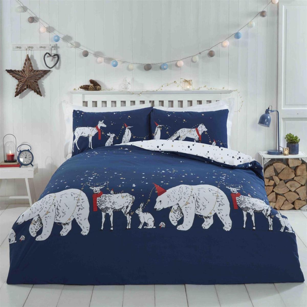 Create a dream winter wonderland look in your bedroom this winter season with Polar Bear and his friends duvet cover set. Various winter animals are making their way across this starry navy duvet, dressed in adorable hats and scarves. Featuring an all-over star patterned reverse on a crisp white duvet, this bedding set is ideal for snuggling up into on cold winter nights and preparing your home for the festive Christmas season.