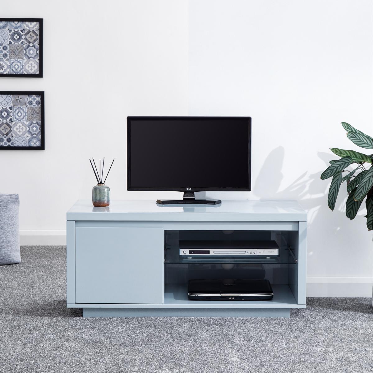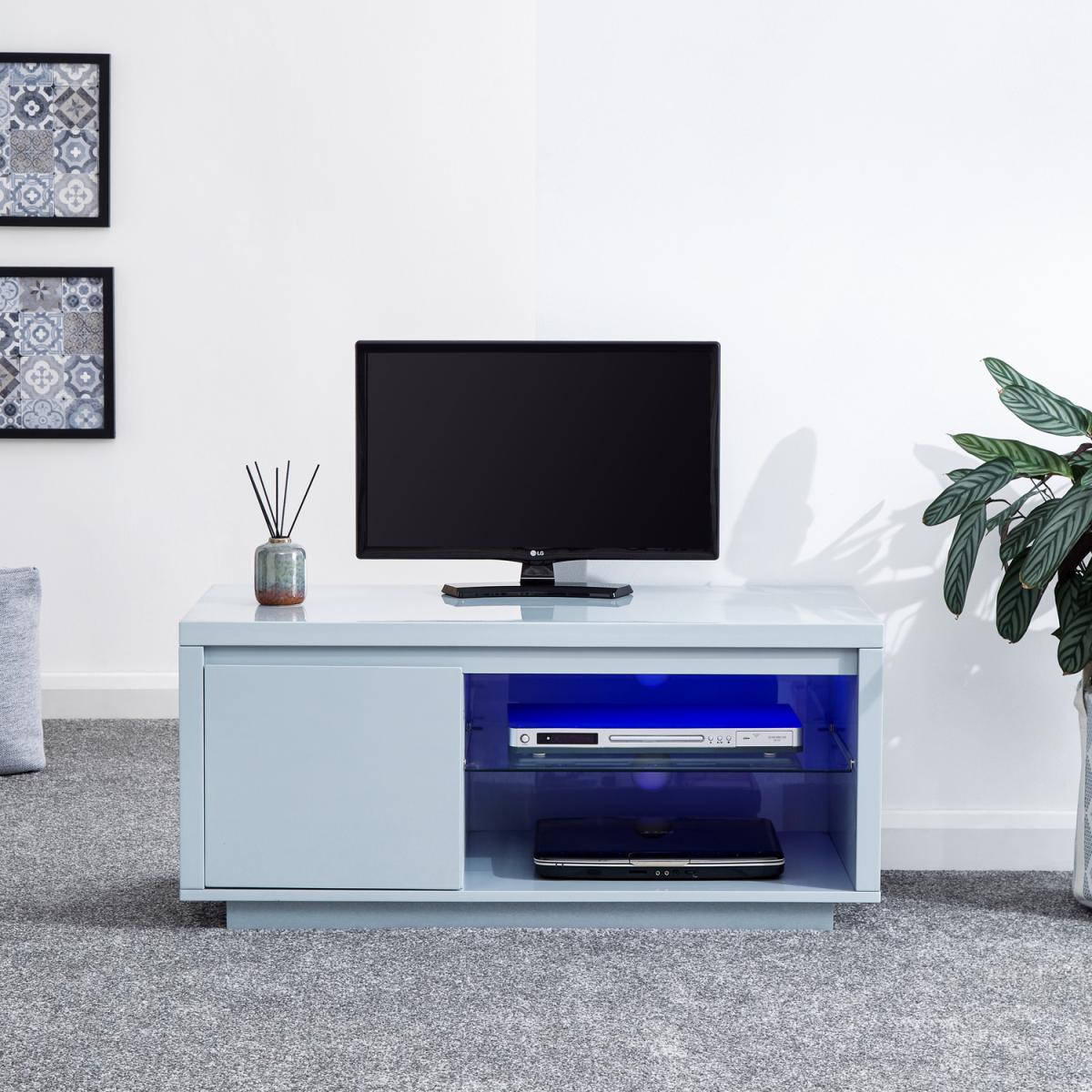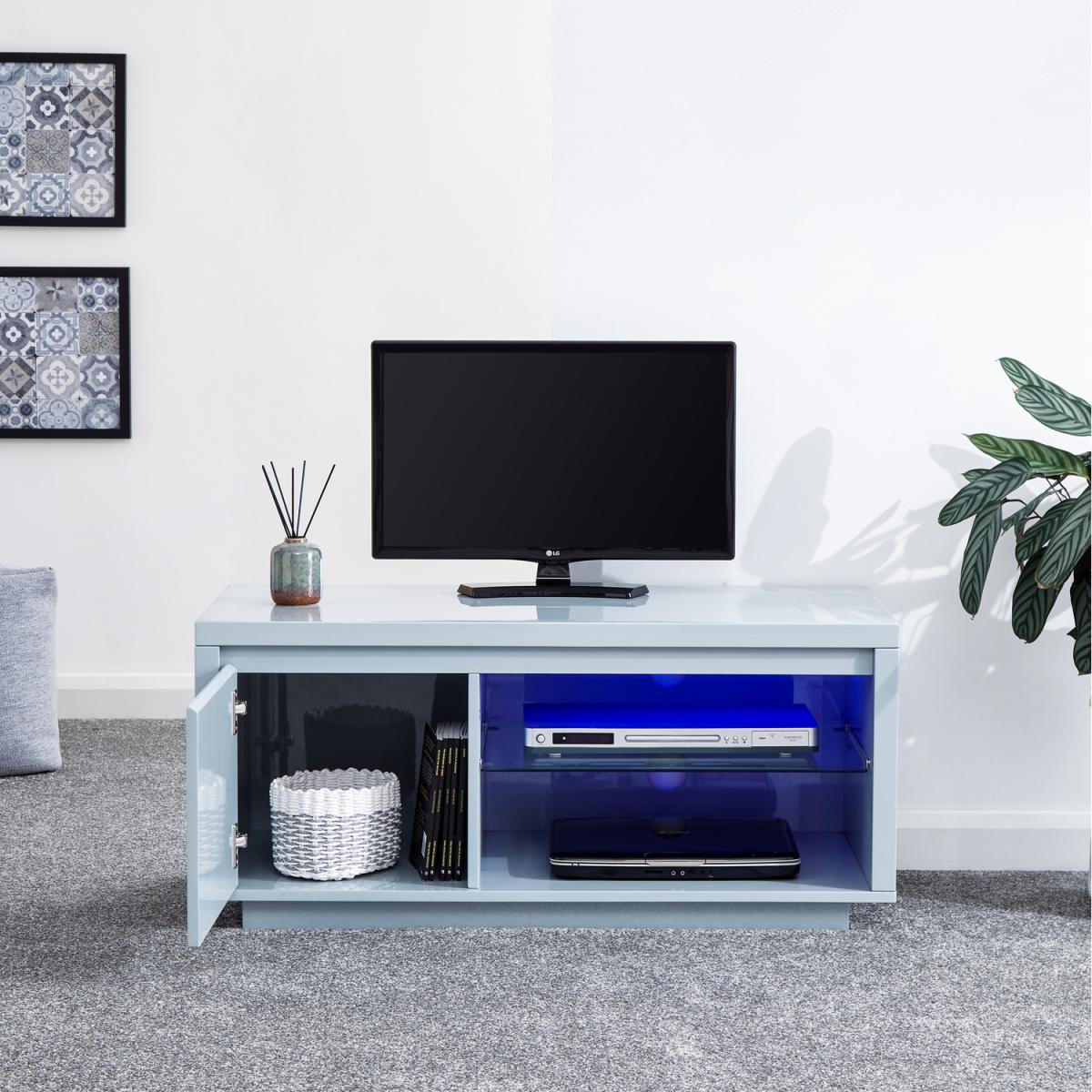 A TV unit with the 'wow' factor! This contemporary furnishing piece is a super-stylish, yet fabulously practical, solution to the perennial problem of elegantly accommodating TV, satellite and gaming consoles. The ultra-modern unit is constructed from practical MDF panels and feature a stunning high-gloss painted finish in polar pure white or grey. Mounted on a recessed plinth, it's asymmetrical design incorporates an enclosed cupboard - perfect for DVDs or games - and a wide aperture complete with a tempered glass shelf and battery-powered LED light.