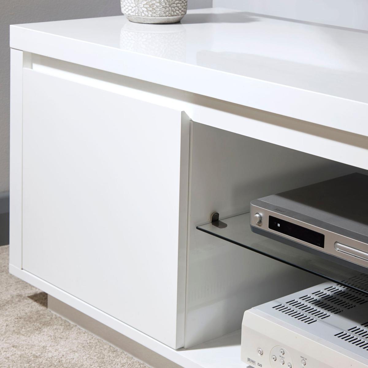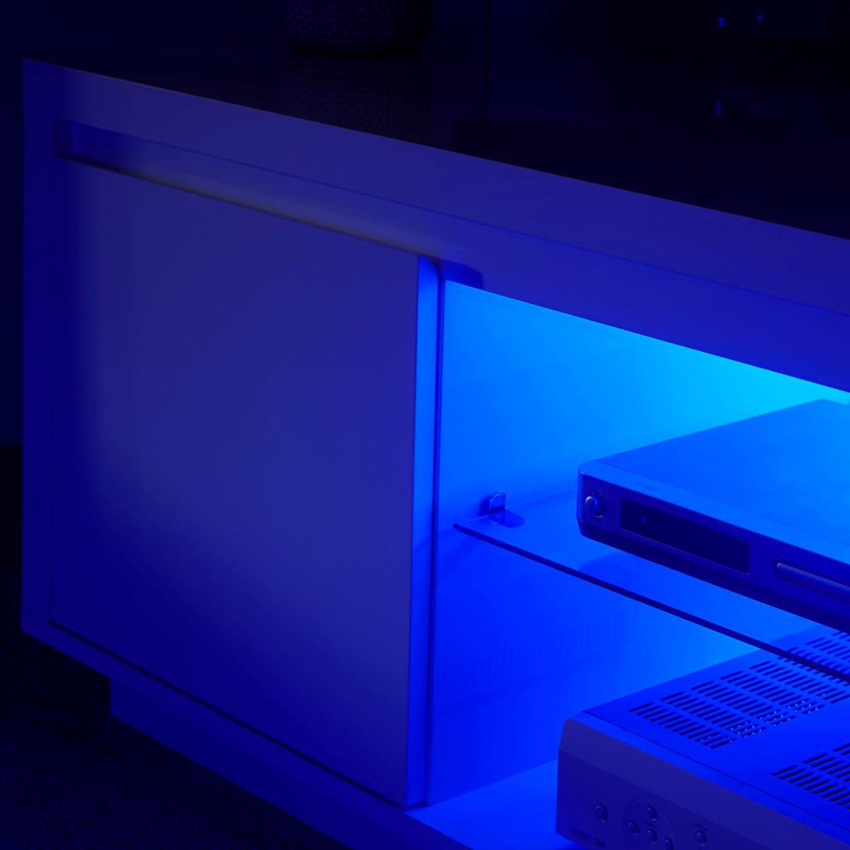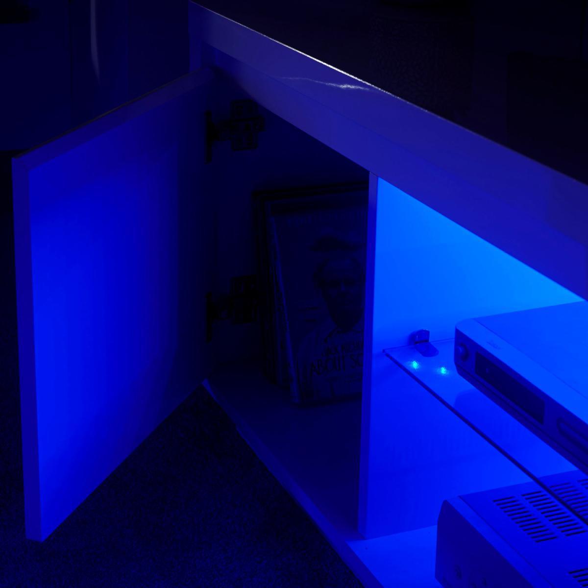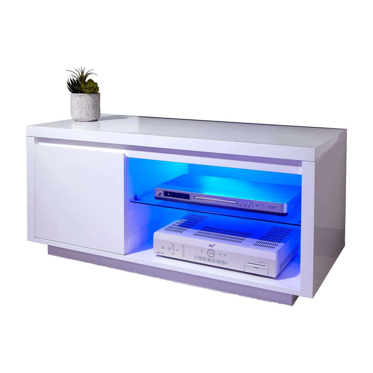 Perfect for any modern living space, the Polar LED TV unit is available in grey and white and features a moisture-resistant high gloss finish and is supplied with battery-operated LED lights, perfect for illuminating items stored beneath or to provide a subtle mood lighting. This self-assembly TV stand features two fixed open shelves, each with cable access and a spacious cupboard. Please note, unfortunately we cannot deliver this item to the Channel Islands.