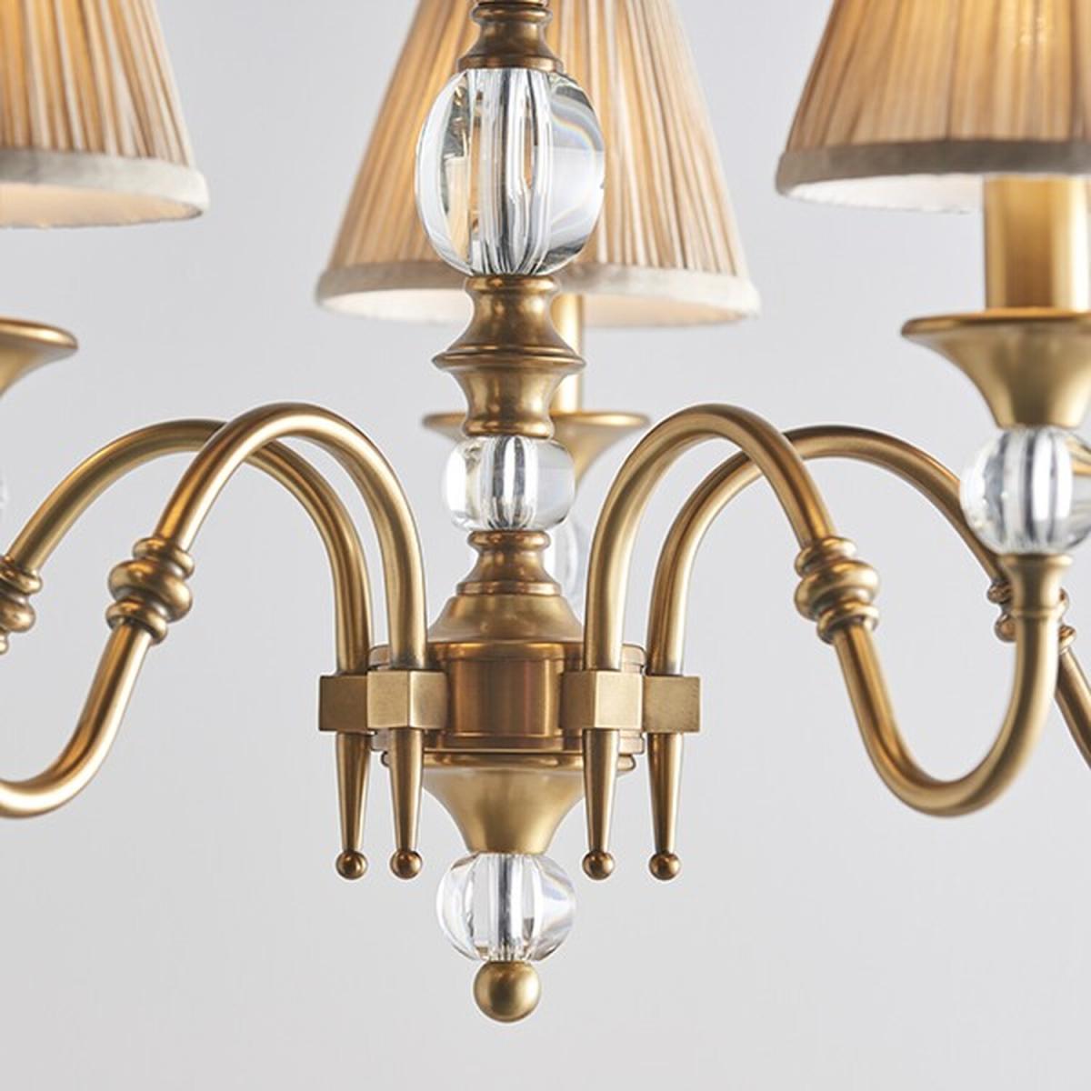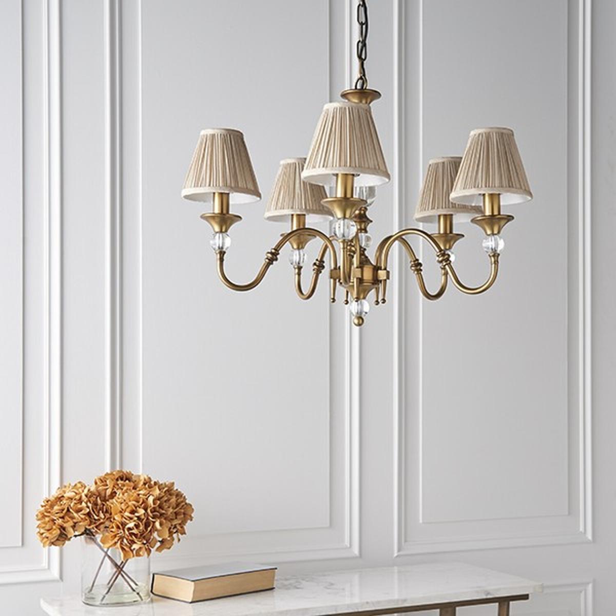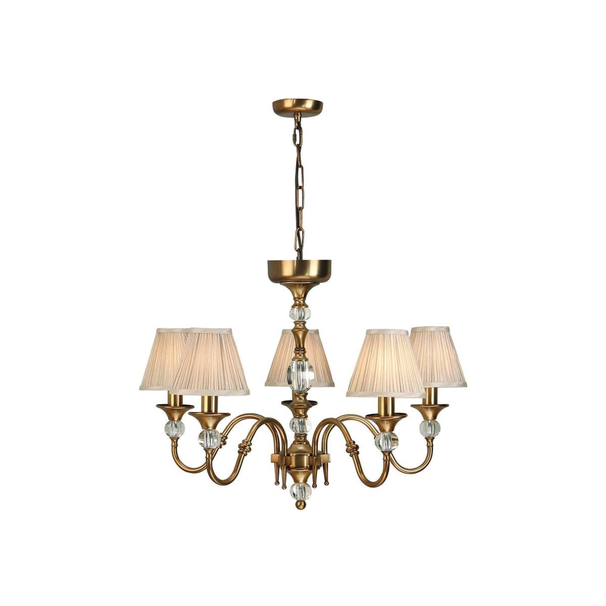 The antique brass five-light pendant is an elegant addition to any room. Finished in an antique brass plate and adorned with k9 crystal glass detailing and beige organza effect shades to give it an opulent feel.