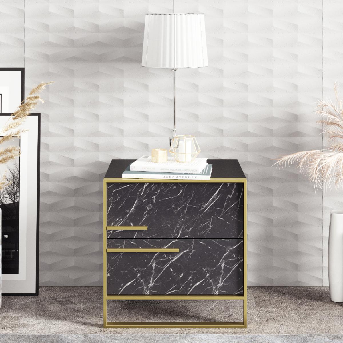 Eye-catching handles and a striking marble-esque face give this bedside table its sense of modern glamour. Adding a dash of sophistication to its surroundings, the table is also full of practicality, with two integrated drawers providing storage space ideal for pyjamas, skincare, books, and other bedtime essentials.