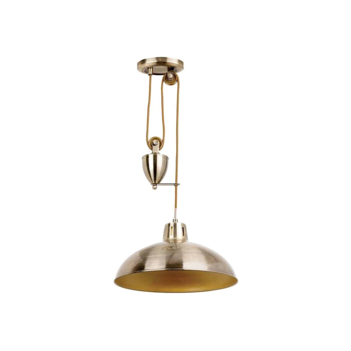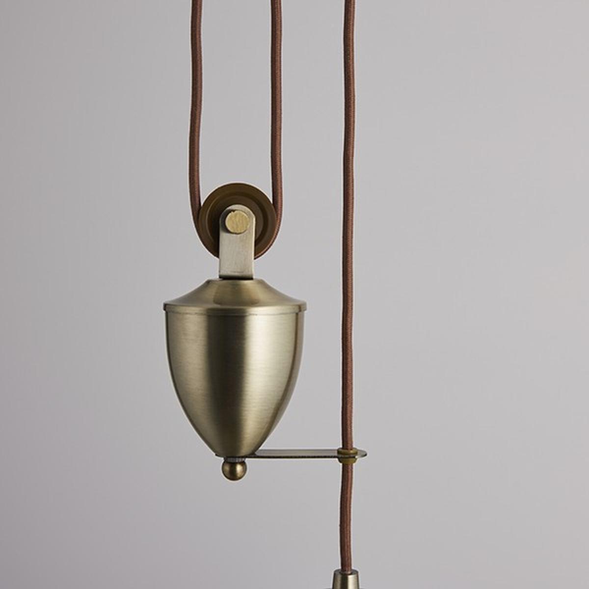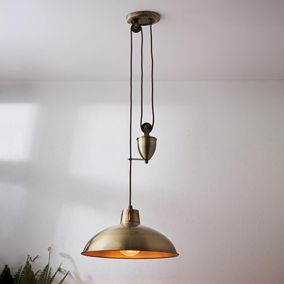 A rise and fall ceiling pendant with an antique brass finish. Height of the light can be adjusted after installation from 92 cm minimum and has a maximum height of 198 cm. For rooms with higher ceilings and for use in dining areas