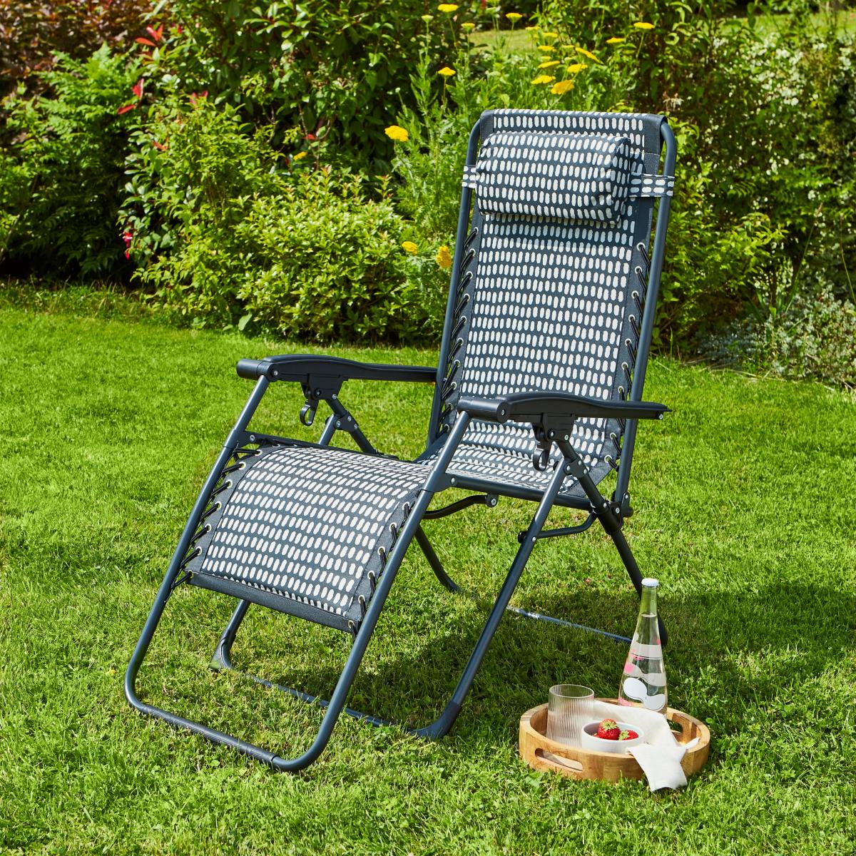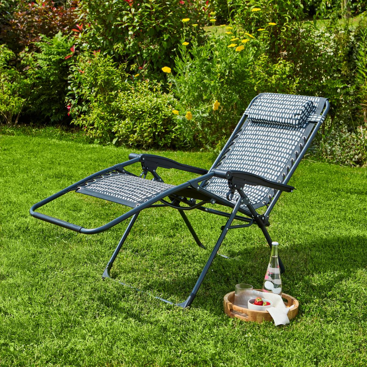 * Monochrome polkadot design * Padded for comfort * Made from metal & polyester * Wipe clean only Relax in style with the Polkadot Monochrome Print Padded Lounger. Featuring a multi-position design and a built-in headrest, it offers supreme comfort for sunbathing or lounging. When not in use, it conveniently folds for easy storage, making it a practical addition to any garden or poolside.