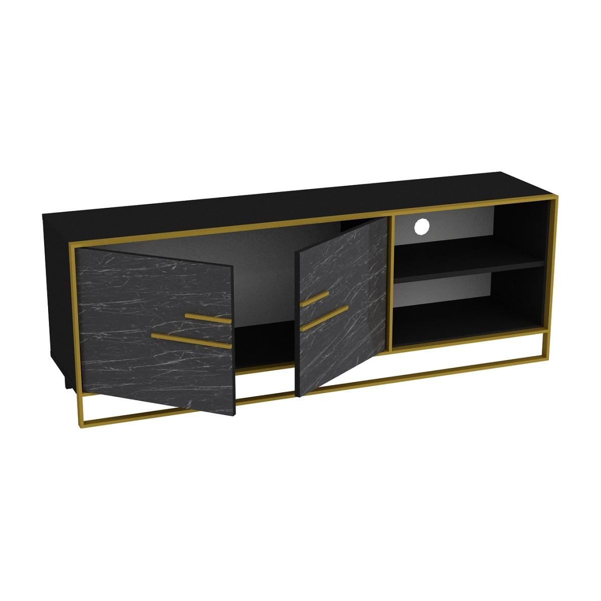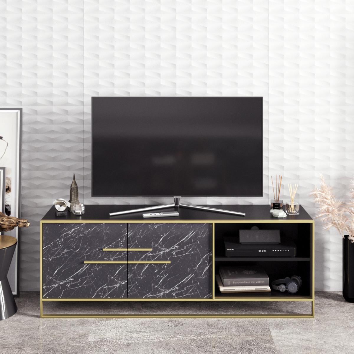 Polkana 63 inches wide metal wood media stand for TVs up to 73'' is defined by practical functionality and streamlined design. With a two-door large cabinet and two half-open shelves, this design offers huge storage space for your books, magazines, TV tuner, remote controller or other media devices/collections. The doors of the cabinet are opened with elegant metal handles. It has a cable management hole in the back panel of the upper half-open shelf. The media stand is made of an 18 mm thick melamine coated particle board and banded with PVC edge banding tape. The metal frame is coated with scratch and impact-resistant industrial static paint. The product will be delivered to the customer in the original package as disassembled. It is designed to be assembled by the customer using a power drill or screwdriver. Assembly instruction and installation hardware are included in the package. For fast and error-free installation, product parts are numbered with stickers in accordance with the assembly guide.