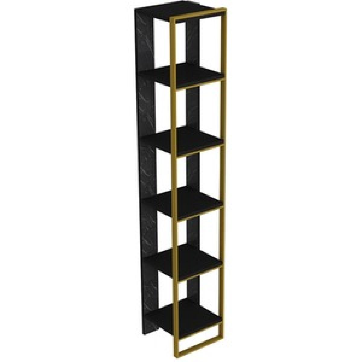 Polkana 178 cm tall metal wood bookcase will add the combination of classic-modern style to your study room with its unique frame which resembles the colour/design of preserved tall columns of Ephesian architecture. The gold colour metal frame makes it sturdy, elegant, and durable. 5 shelves will enable you to display your books just like you want. Thanks to its special design, you may place it in any corner and adjust its position. It can easily be mounted to the wall (wall-mounting hardware included). It is made of an 18mm thick melamine coated particle board and banded with PVC edge banding tape. The bookcase frame is constructed from iron metal coated with scratch and impact-resistant static paint. The product will be delivered to the customer in the original package as disassembled. It is designed to be assembled by the customer easily using a power drill. Assembly instruction and installation hardware are included in the package. For fast and error-free installation, product parts are numbered with stickers in accordance with the assembly guide.