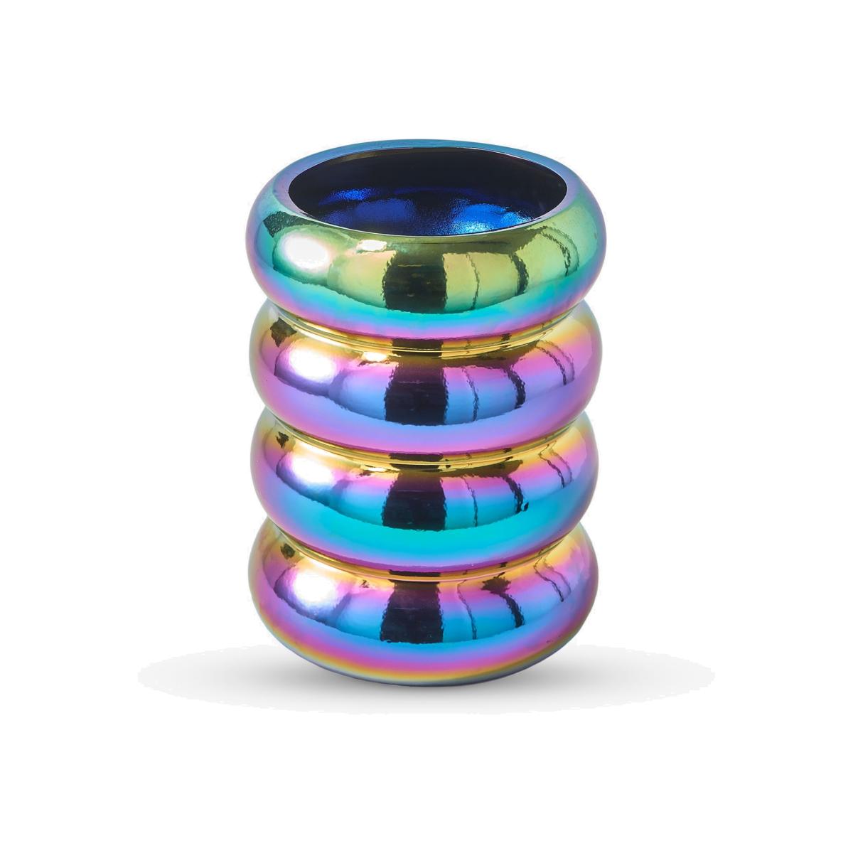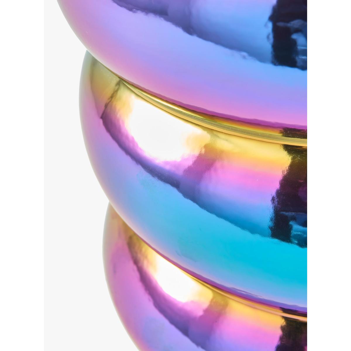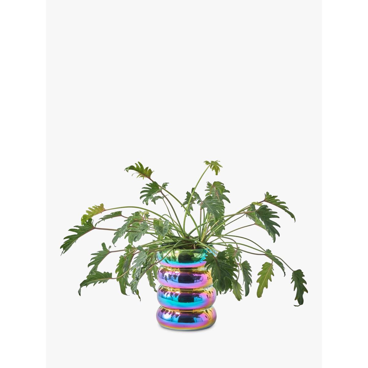 I love this colourful pot for its bold, iridescent finish, which instantly adds a fun, contemporary twist to any space. It works particularly well in modern interiors, especially those with minimal or monochrome palettes, as it acts as a striking accent piece. It's versatile enough to sit on a shelf, countertop, or even as a centrepiece on a dining table. To style it effectively, pair it with lush green plants or succulents, allowing the vibrant hues to stand out without competing with other décor. Practical tips include using it to create a playful display by combining different sizes or finishes, but keep in mind that its glossy surface can be prone to fingerprints, so regular cleaning will maintain its eye-catching appeal.