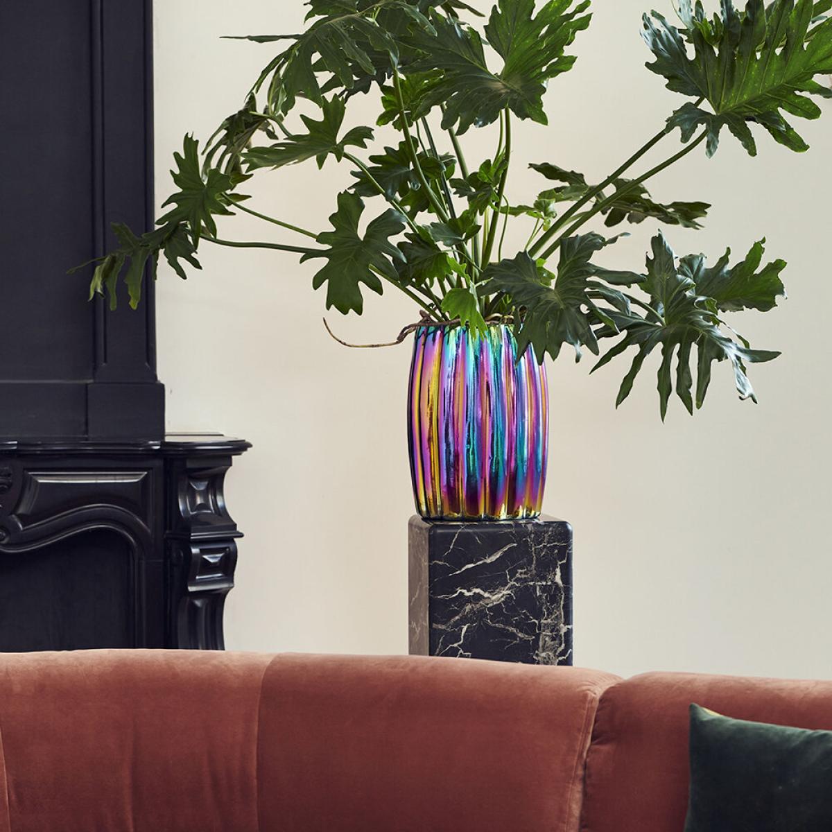 I love this colourful pot for adding a playful touch to any space. Its iridescent finish makes it a great statement piece, especially in contemporary or eclectic interiors. It works well as a standalone feature or grouped with other planters to create a striking display. For styling tips, try pairing it with a variety of greenery-think tall, architectural leaves or cascading plants-to accentuate its curvy shape and vibrant tones. It’s versatile enough to work in living rooms, kitchens, or even bathrooms, adding a pop of colour and texture wherever it’s placed. This pot is perfect for bringing personality and a modern edge to your plant styling.