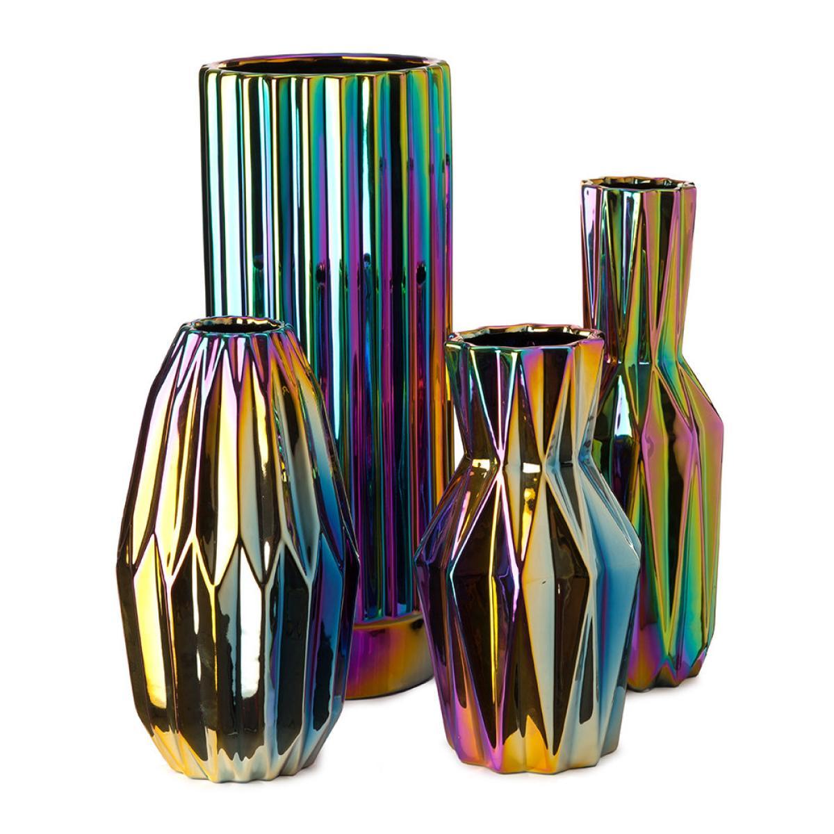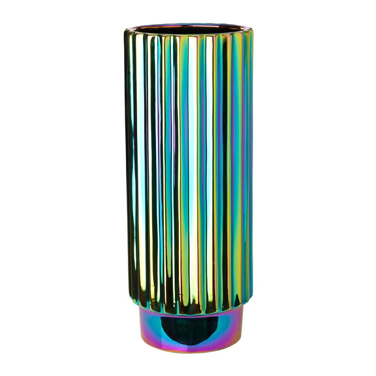 I love this colourful vase for adding a bold, contemporary touch to any space. Its iridescent finish and textured folds make it a real statement piece that works well in minimalist or modern interiors, especially when styled with a few simple, streamlined blooms or even left empty to showcase its unique surface. Practical styling tips include placing it on a low side table or shelf where its colour and texture can be appreciated from multiple angles. It also pairs nicely with neutral or muted palettes, allowing its vibrant hues to really stand out. Overall, it's a versatile piece that can elevate both everyday and more sophisticated settings.