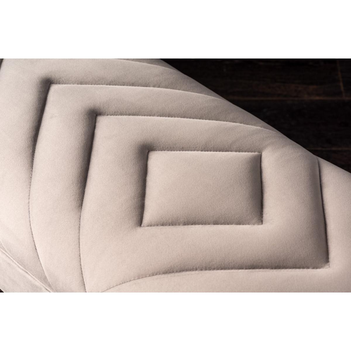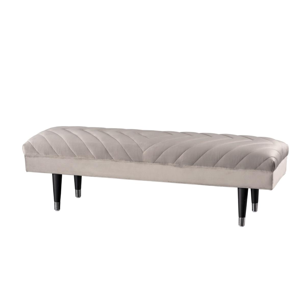 A beautiful upholstered bench, ideal for use at the end of your bed, in your hallway or as a footstool/ extra guest seating in your lounge. Unique ‘mirrored chevron’ quilting design. Velvet upholstery fabric. Black stained solid ash legs with characterful metal ferrules. Minimal assembly required, simply attach legs.