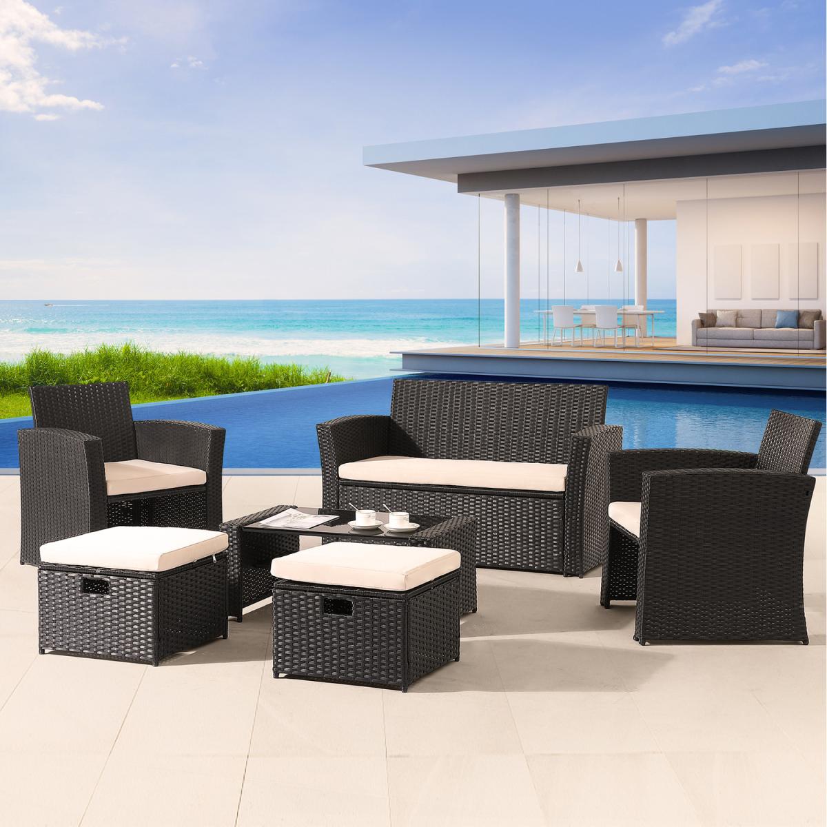 AREBOS Rattan Lounge VERONA "High quality garden furniture for your home!" This appealing lounge suite made of poly-rattan combines design with functionality. In addition, this set will become the center stage of your backyard, patio or balcony. As soon as the first sun rays start to appear, the center of our lives shifts from indoors to outdoors. With this garden lounge set from AREBOS you can from now on enjoy your coffee in the backyard, on the patio or even on a small balcony. During evening gatherings with friends, family or neighbors, this balcony lounge set offers sufficient space and maximum convenience. Create your own little feel-good oasis or your own space for relaxing outdoors. Made of premium UV resistant poly-rattan mesh - easy cleaning guaranteed Comfortable and water-resistant cushions included in the delivery scope The covers of the cushions are removable and washable and hence easy to clean Spacious storage space for the upholstered cushions in the "interior" of the sofa Single elements can be combined and moved freely Stools can be easily stored under the armchair when not in use High load capacity guaranteed due to use of high-quality materials The lounge is space-saving and stackable The set convinces with its space-saving feature of storing the stools underneath the armchair when not in use. Convenient stowage due to additional storage space Underneath the seating area of the sofa there is a functional storage box for storing the water-resistant cushions. Sturdy mesh The AREBOS lounge suite is made of handmade poly-rattan mesh, which is extremely resilient and yet easy to clean. Invite family and friends to enjoy wonderful evenings on this comfortable rattan lounge set. Water resistant, low-maintenance and removable covers The color-matching cushions all feature a zipper, making cleaning these low-maintenance polyester covers a piece of cake. The dirt-repellent poly-rattan mesh is easy to clean and requires hardly any maintenance.