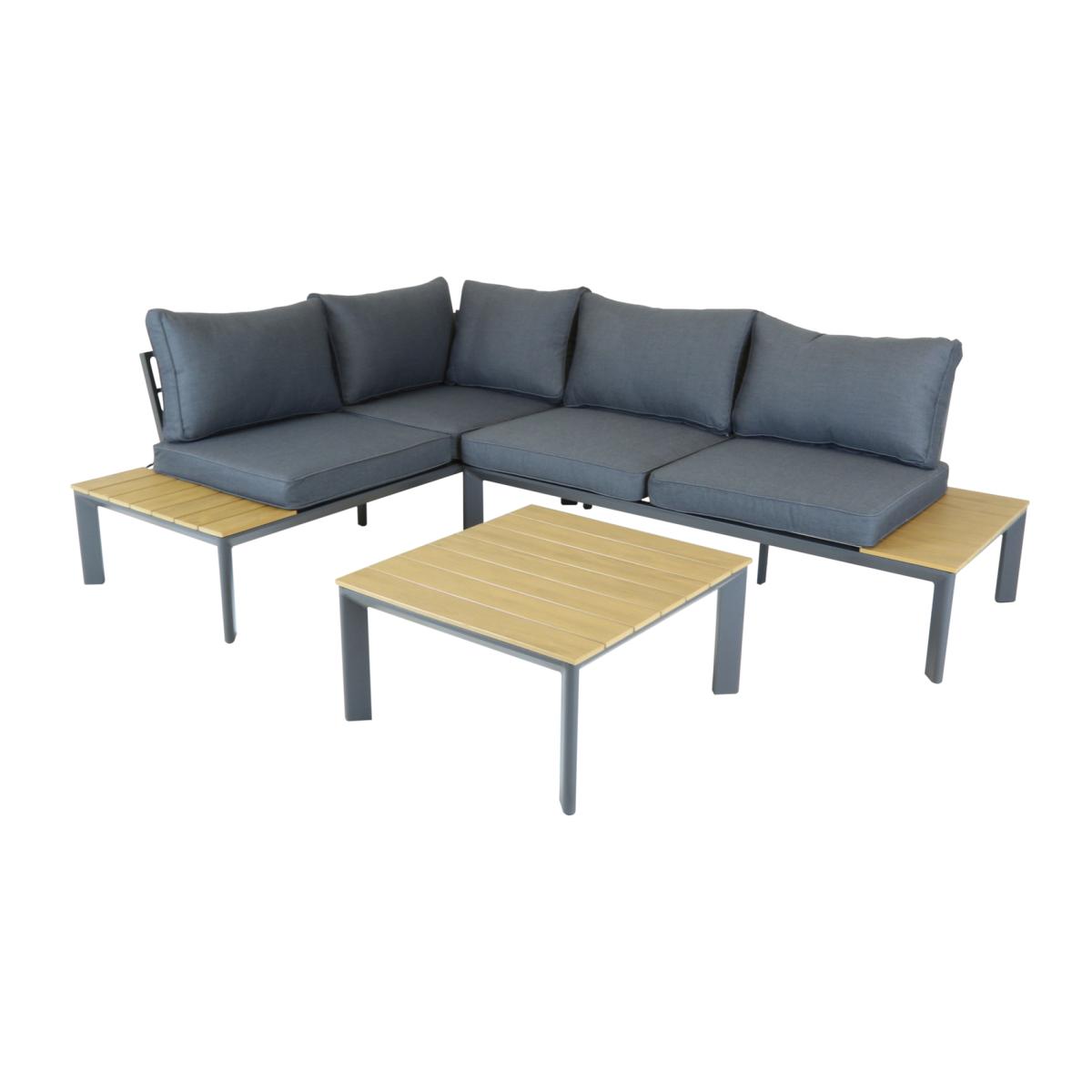This stylish Charles Bentley Polywood Lounge Set with a Recliner Seat adds a contemporary and modern look to any outdoor space and is ideal for relaxing in your garden. This set includes a large corner sofa and a large coffee table, both constructed with an aluminium frame and a Polywood top. The sofa has extra thick 8cm dark grey cushions for added comfort. This set also features a reclining chair so you can lay back and relax with a book when not socialising with family and friends. Features. Extra thick grey 8cm cushions. Reclining Seat in the corner of the sofa. Wood panel effect detailing on tables. Accessible additional table space either ends of the sofa. Back cushions for extra comfort Contemporary designIncludes. 1 x Large corner sofa1 x Coffee table2 x Attached side tablesMaterialsAluminiumPolywood. Cushion Fabric Polyester 220gDimensions. 2 Seater sofa W155 x D74 65 x H65 29.5cm2 Seater corner sofa with adjustable seat W159 x D7465 x H6529.5cm Coffee Table W70 x D65 x H34.5cmWeights Table 5.68kg2 Seater with adjustable seat 10.45kg2 Seater 8.55kg1 Back Cushion 1.7kg1 Seat Cushion 1.5kg. Total 39.18kgColours. Frame Black Cushions Dark Grey Additional Info. Cushion Thickness 8cm. Floor to seat height with cushion 37.5cm. Table maximum load weight 25kg2 Seater Maximum load weight 240kg2 Seater with adjustable seat 240kg. Some self-assembly required. Full instructions provided. This product will be delivered on a pallet, which cannot be disposed of by the courier team. The recipient will be responsible for the disposal of the pallet.