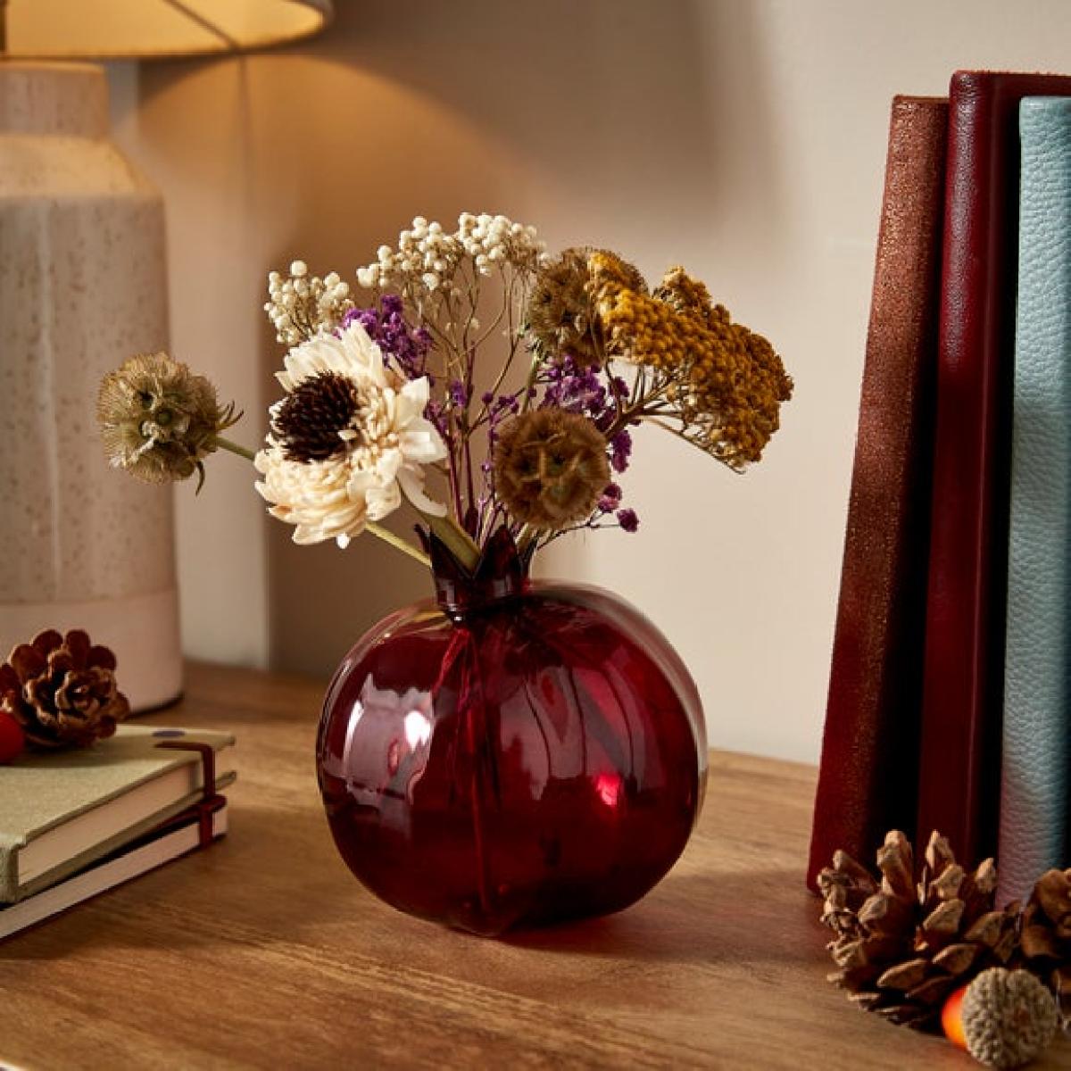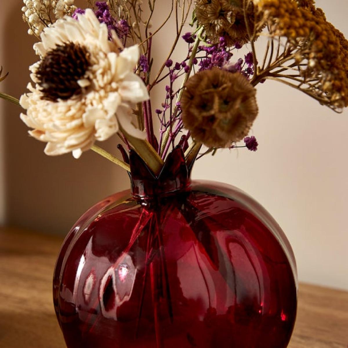 I love this little pomegranate glass vase for its vibrant colour and compact shape, making it a versatile addition to various interiors. It works particularly well in minimalist or contemporary spaces where its rich hue can add a pop of colour without overpowering the decor. It's perfect for showcasing a small, seasonal bouquet or a few sprigs of greenery on a side table, shelf, or windowsill. For a styled look, try pairing it with neutral-toned ceramics or natural materials like wood and linen, which will allow the vase’s colour to stand out. Its size also makes it an ideal accent piece in both cosy corners and more open settings, adding visual interest without cluttering the space.