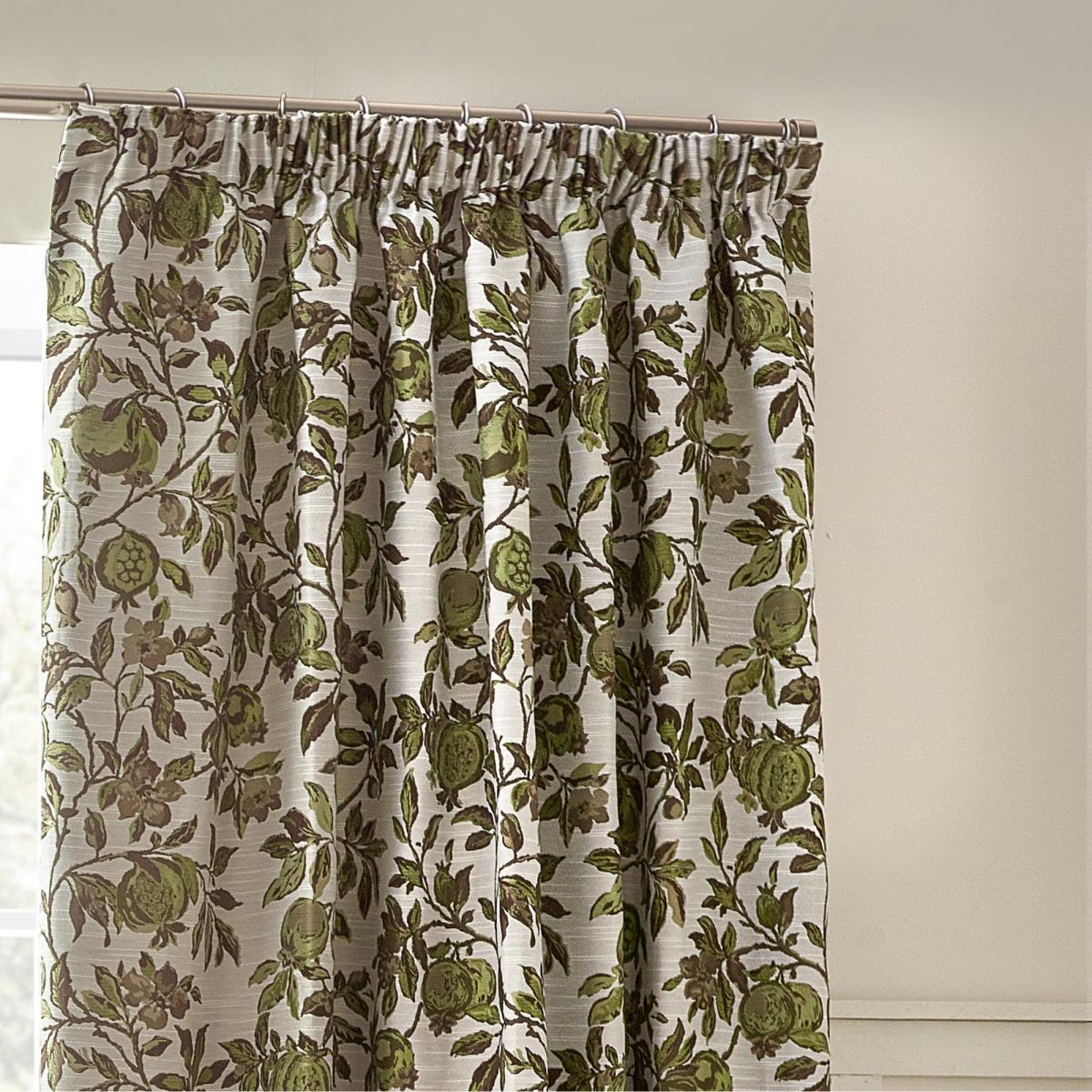 * 1 pair - includes 2 x curtain panels* Jacquard composition* Floral Design* Pencil Pleat Header* Multiple sizes available The Pomegranate Green curtains offer a timeless floral jacquard pattern, available in natural, earthy tones. Finished with a pencil pleat header and matching tiebacks, these panels bring elegance to your space. The 100% polyester fabric is soft, durable, and features room-darkening properties for added privacy and warmth.