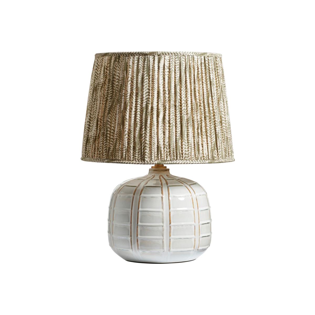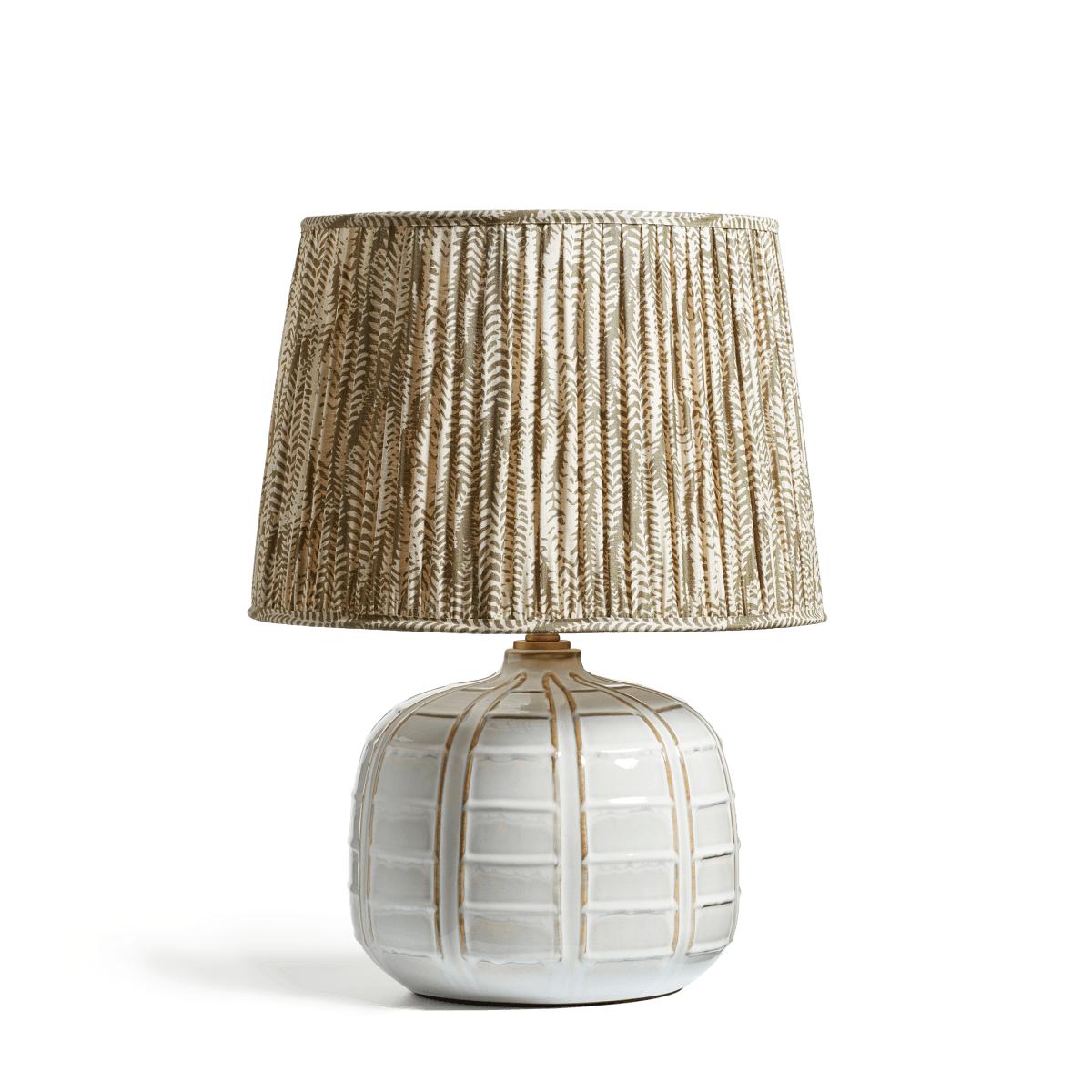 The rounded shape of the Pompion is pleasingly offset by its raised clean lines. The pattern is left bare of the ivory glaze to highlight its relief design. The lamp’s shiny surface will pick up the light that’s directed downwards by your chosen shade.