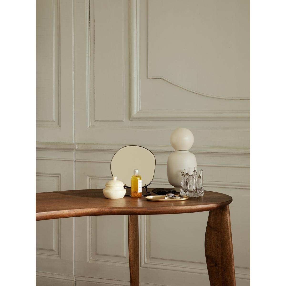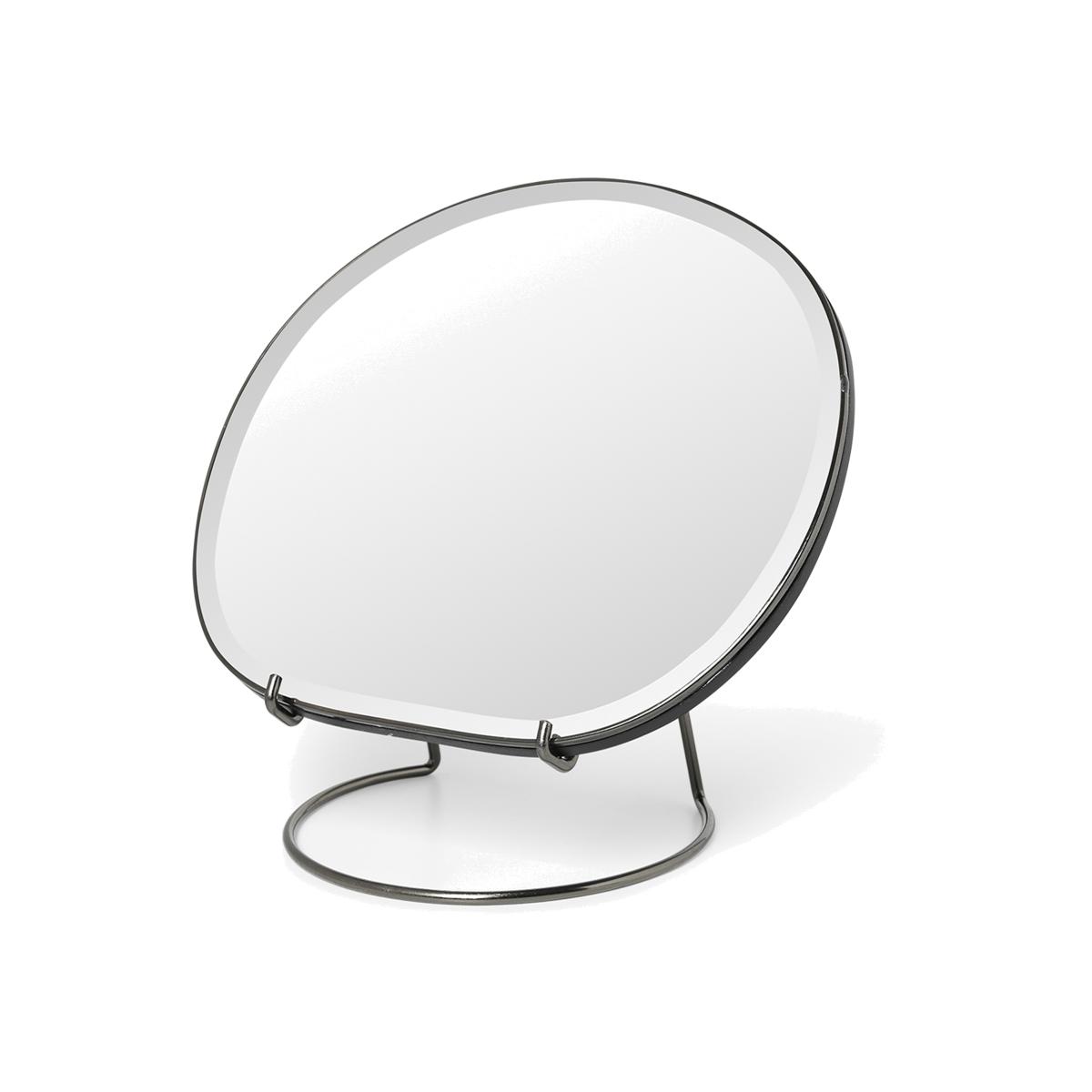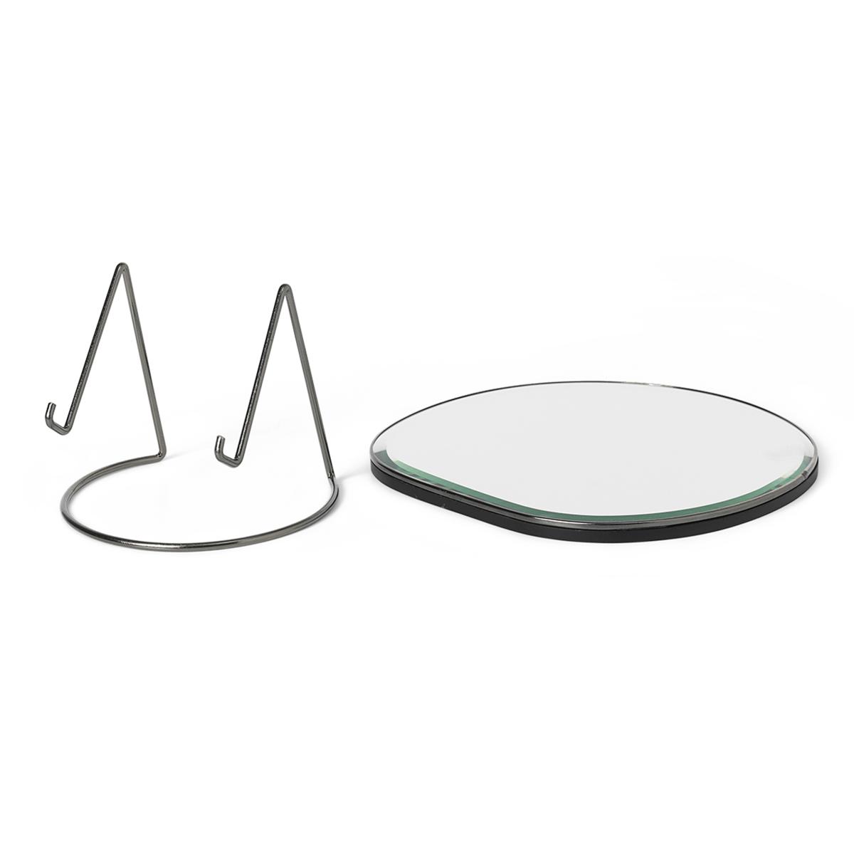 Table mirror Pond from Ferm Living is an elegant and practical tool for your daily routine. The table mirror is tilted on a stand and has been inspired by flowing water. The mirror has a round shape with a flat line along the underside and is suitable in the bathroom or in the hall.