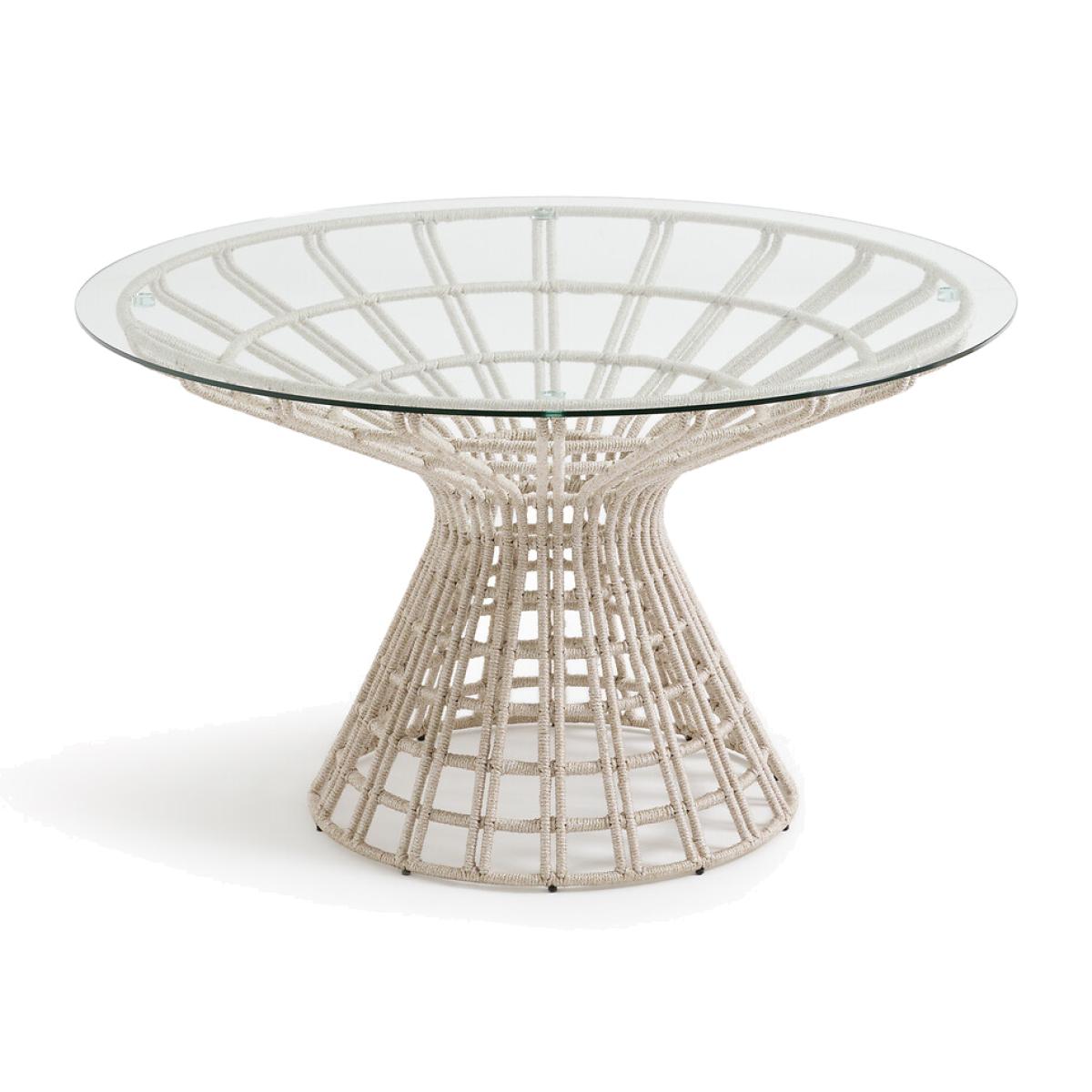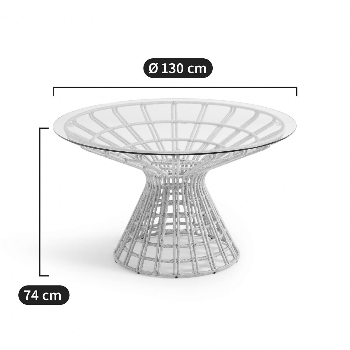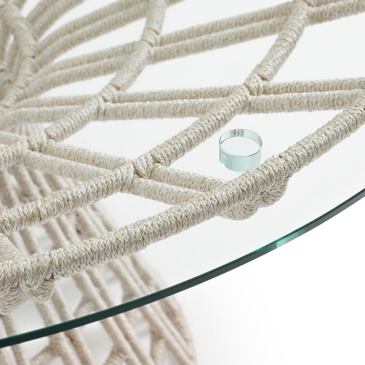 Striking and graphic with its transparent top and openwork structure, Poniente reinvents the 1970s, through the use of hand-woven rope and tempered glass.. This garden table is ideal for 6 guests. It is also furniture made to last. Its steel structure has been treated with anti-corrosion technology, then epoxy lacquered and covered with synthetic rope for a long-lasting design. This contemporary piece with the AMPM signature could be the centrepiece of your living room as well as your terrace. Product Details • Base and structure: anti-corrosion treated steel, epoxy paint finish, covered with hand-woven synthetic polyester rope • Clear tempered glass top, glued glass pellets, straight edge • Assembly required. Care Advice • Cleaning: use a damp soft cloth and a little soapy water • Low temperatures are likely to affect the proper functioning and surface condition of your outdoor furniture. We therefore advise you to store it in a dry, ventilated and closed room.. • We strongly advise against the use of a tarpaulin because it will act as an oven and will damage the surface conditions; wood and metal products are particularly concerned. • Before any storage, remember to clean and dry the products well, in order to prevent the appearance of mould or unpleasant odours.. • In any case and regardless of the material, it is not recommended to leave the furniture outside without protection, particularly during bad weather and the winter phase.. Quality Info • Anti-corrosive metal is coated with epoxy paint which makes it easy-care and resistant to rust and bad weather. • Our table tops are made of tempered glass for your safety. Tempered glass is 5 times more impact resistant than conventional glass. Dimensions • Diameter: 130cm • Height: 74cm • Weight: 59kg. Dimensions and weight of parcel • 2 parcels • L124 x D124 x H80cm, 43.5kg • L140 x D140 x H7cm, 30kg