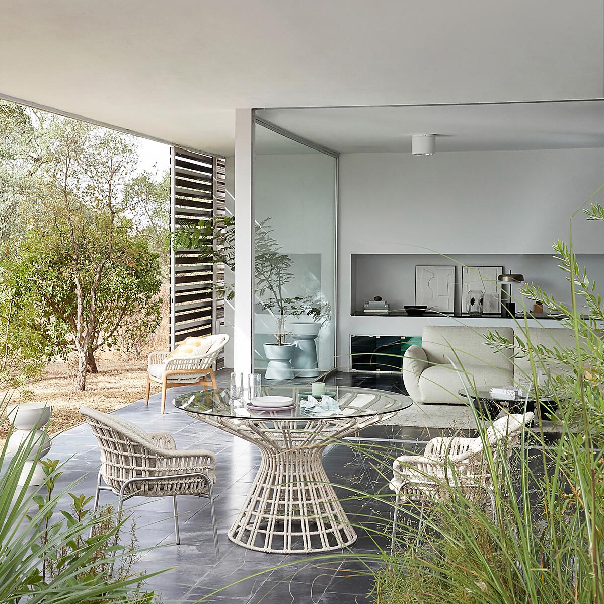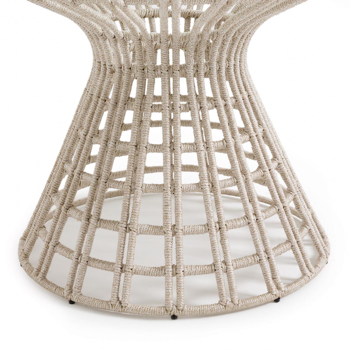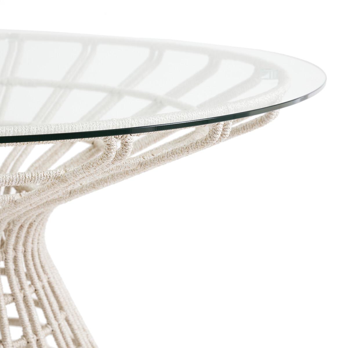 Striking and graphic with its transparent top and openwork structure, Poniente reinvents the 1970s, through the use of hand-woven rope and tempered glass.. This garden table is ideal for 6 guests. It is also furniture made to last. Its steel structure has been treated with anti-corrosion technology, then epoxy lacquered and covered with synthetic rope for a long-lasting design. This contemporary piece with the AMPM signature could be the centrepiece of your living room as well as your terrace. Product Details • Base and structure: anti-corrosion treated steel, epoxy paint finish, covered with hand-woven synthetic polyester rope • Clear tempered glass top, glued glass pellets, straight edge • Assembly required. Care Advice • Cleaning: use a damp soft cloth and a little soapy water • Low temperatures are likely to affect the proper functioning and surface condition of your outdoor furniture. We therefore advise you to store it in a dry, ventilated and closed room.. • We strongly advise against the use of a tarpaulin because it will act as an oven and will damage the surface conditions; wood and metal products are particularly concerned. • Before any storage, remember to clean and dry the products well, in order to prevent the appearance of mould or unpleasant odours.. • In any case and regardless of the material, it is not recommended to leave the furniture outside without protection, particularly during bad weather and the winter phase.. Quality Info • Anti-corrosive metal is coated with epoxy paint which makes it easy-care and resistant to rust and bad weather. • Our table tops are made of tempered glass for your safety. Tempered glass is 5 times more impact resistant than conventional glass. Dimensions • Diameter: 130cm • Height: 74cm • Weight: 59kg. Dimensions and weight of parcel • 2 parcels • L124 x D124 x H80cm, 43.5kg • L140 x D140 x H7cm, 30kg