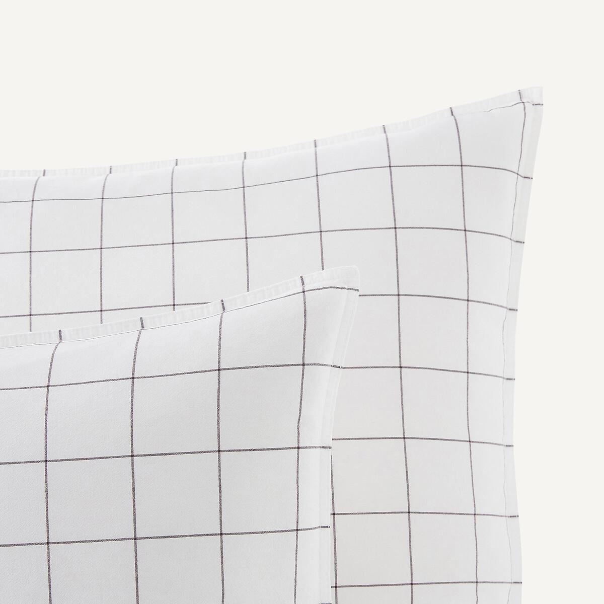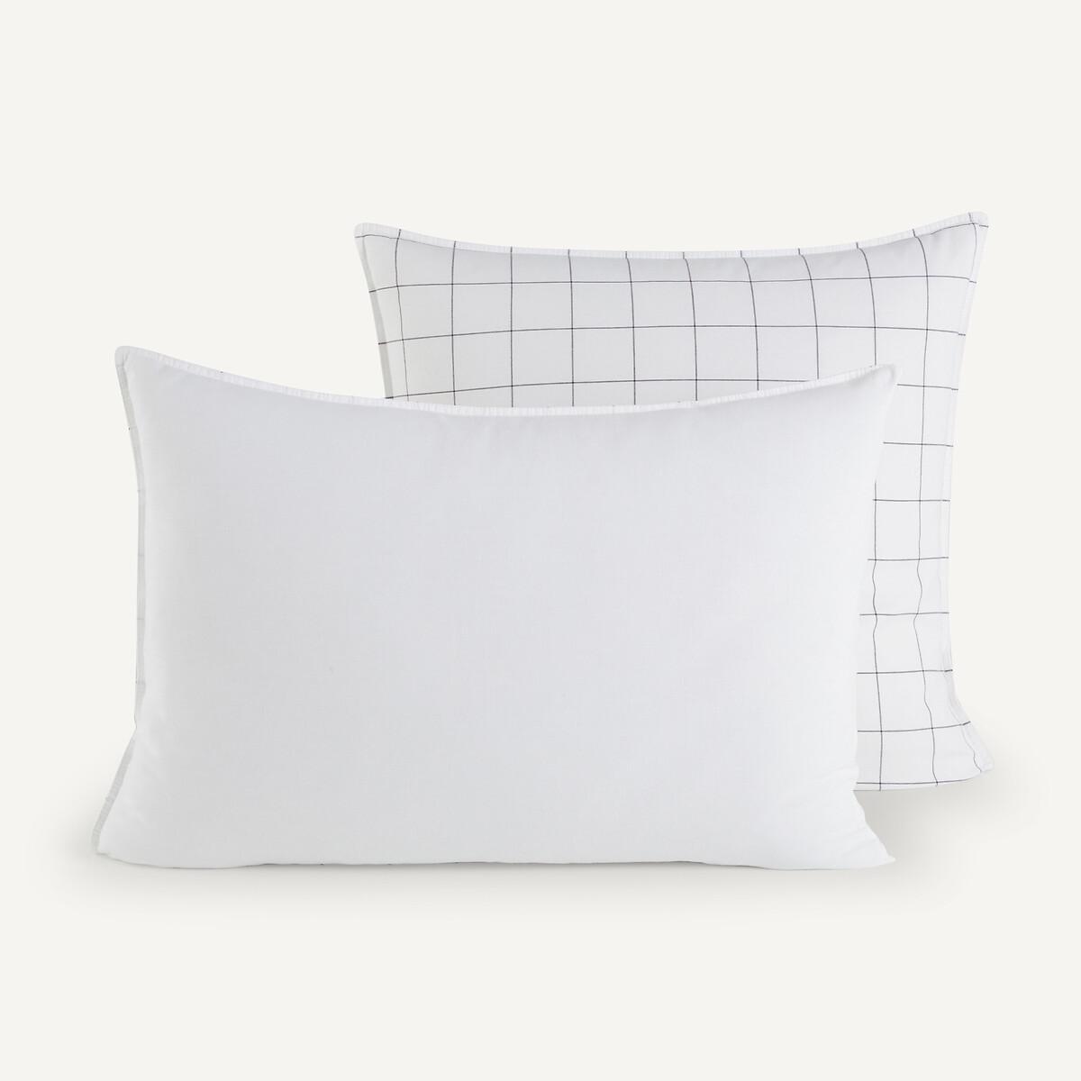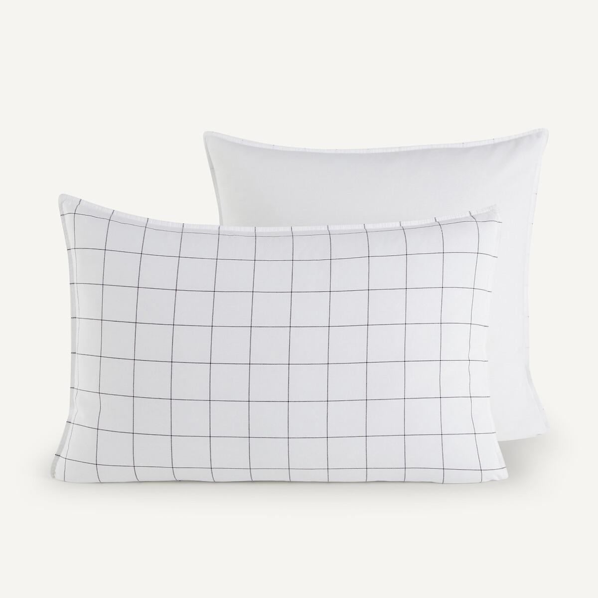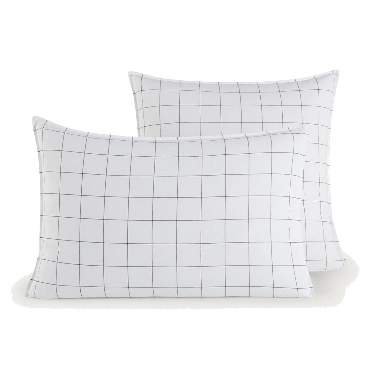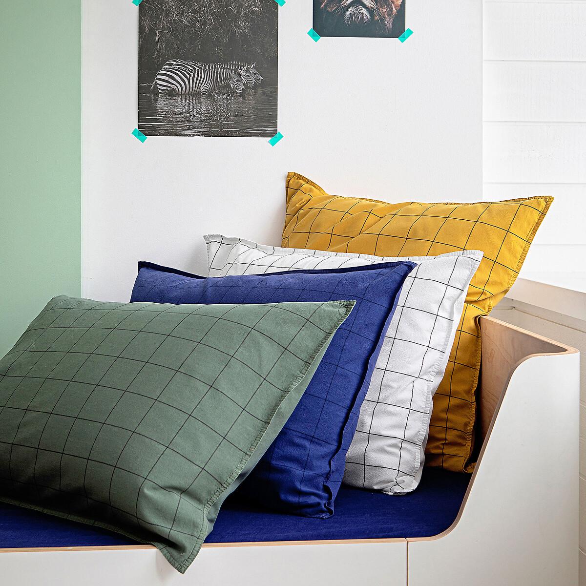 The Ponlok organic cotton pillowcase. Reversible with a large check pattern on one side and another plain side for a sober and timeless adornment. Cotton is part of our daily lives. We love it for its suppleness and softness. Easy Care, it is ideal for the beds of young and old alike!Product Details • 100% cotton • Organic cotton • 300 thread count: a common indicator for measuring the quality of fabric is the number of threads per cm². Different sensations are made possible thanks to the weaving and the number of threads present. Indeed, an optimal number of threads makes the bed linen particularly soft. Care Advice Follow our care tips to maintain the quality of your laundry • Machine washable at 60°C • By washing your laundry at 40°C instead of 60°C, you limit energy consumption • Tumble dry at low temperature • Iron at average temperature • Do not dry clean. Dimensions • 50 x 70cm: Rectangular • 65 x 65cm: Square • Cotton from organic farming. Organic farming does not use any chemicals, pesticides, insecticides or GMOs. Produced with minimal impact on biodiversity. • OEKO-TEX® Standard 100. Standard 100 certification by OEKO-TEX® tests textile products for harmful substances via an independent, international label.
