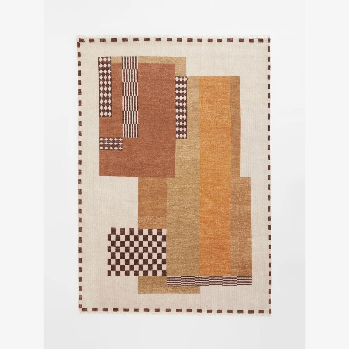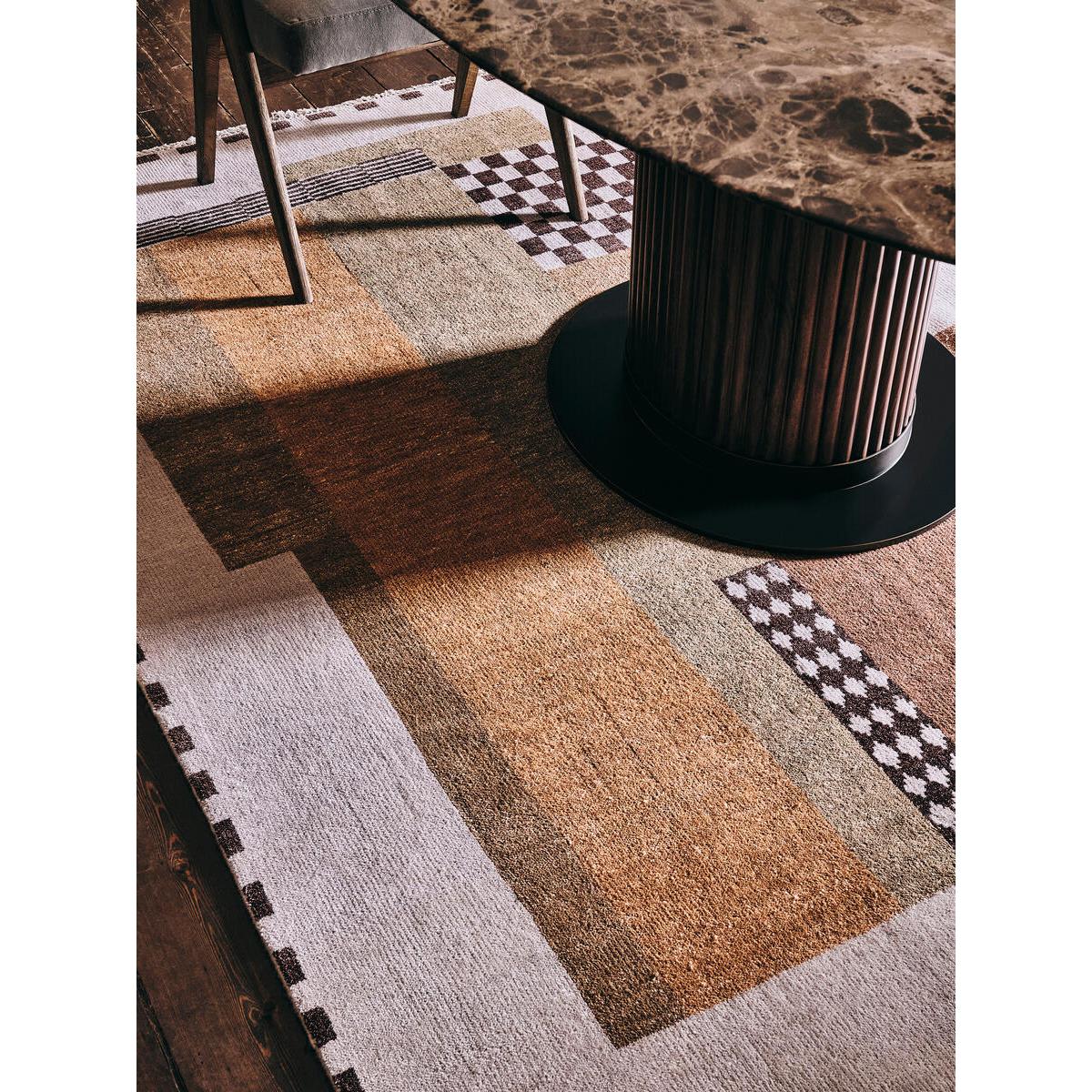 I love this rug for its bold, contemporary design and versatile colour palette, making it a great statement piece that can anchor a modern living room or a minimalist bedroom. Its abstract, geometric pattern adds interest without overwhelming the space, while the warm earthy tones keep it grounded and highly adaptable. It works particularly well with neutral furniture, but can also complement darker or textured fabrics for a layered, eclectic look. Practical styling tips include layering with smaller, patterned cushions or throws to enhance its graphic vibe, and placing it beneath a coffee table or dining table to define and energise the space. Its substantial size makes it ideal for larger formats or open-plan setups where it can really make an impact.