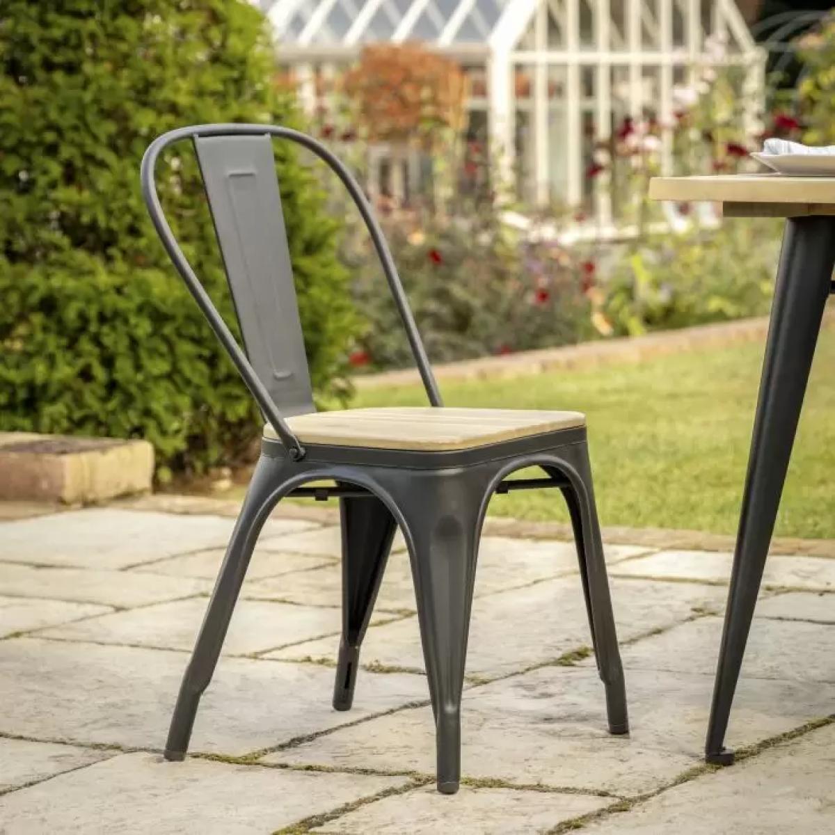 Add a modern industrial look to your outdoor space with this bold dining chair. Featuring a FSC Acacia wood seat with a natural finish and contrasting industrial style dark powder coated metal legs and back, this chair will make a style statement, perfect for a modern urban garden. Additional coordinating round and rectangular dining tables are available. Material: Acacia 80% / Iron 20%. Colour/Finish: Natural.
