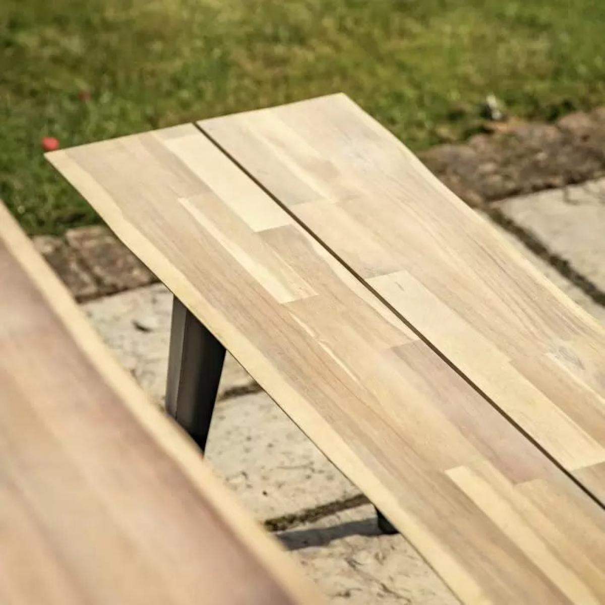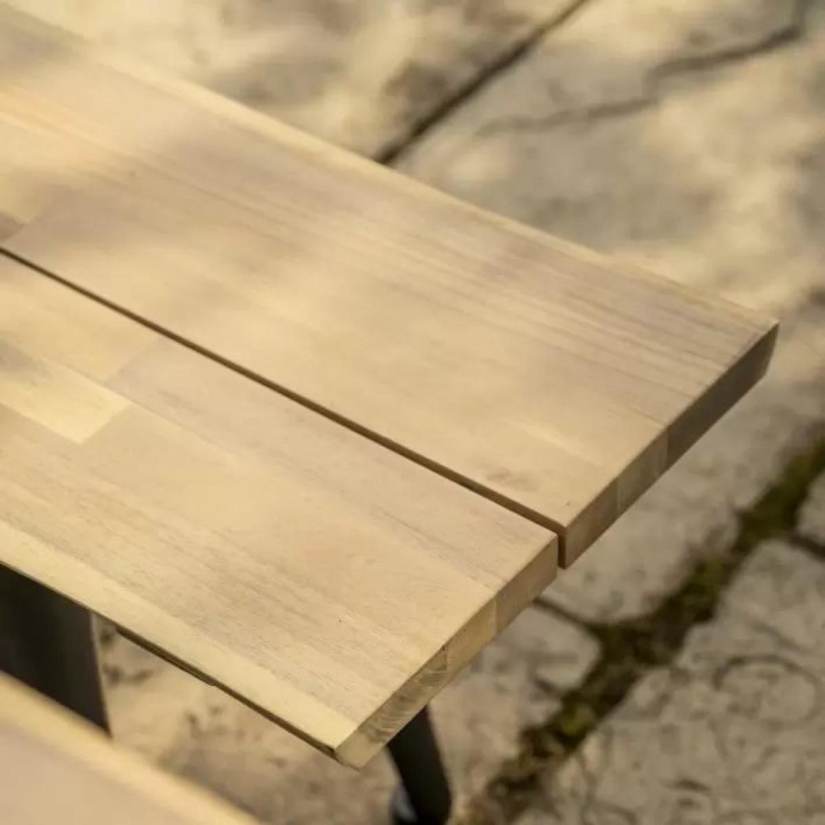 Add a modern industrial look to your outdoor space with this bold dining bench. Featuring a Acacia wood top with a natural finish and contrasting industrial style dark powder coated metal legs, this dining bench will make a style statement, perfect for a modern urban garden. Additional coordinating dining table and chairs also available.