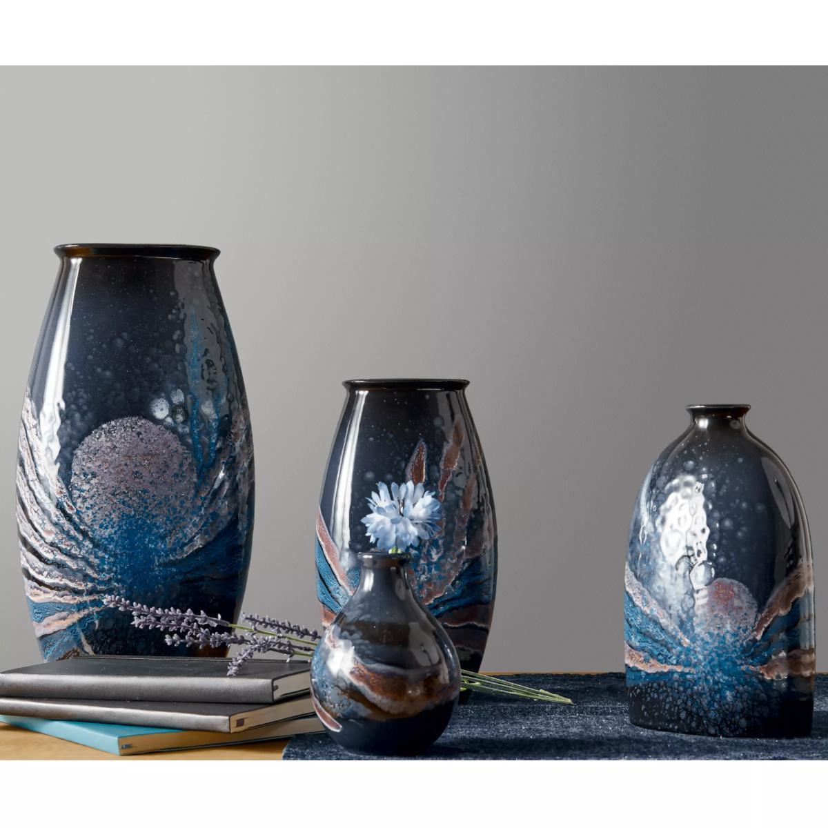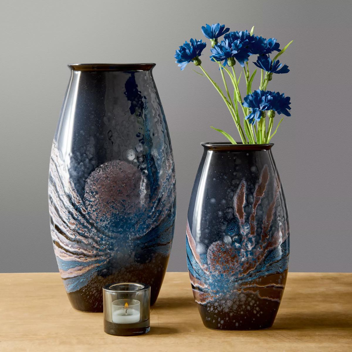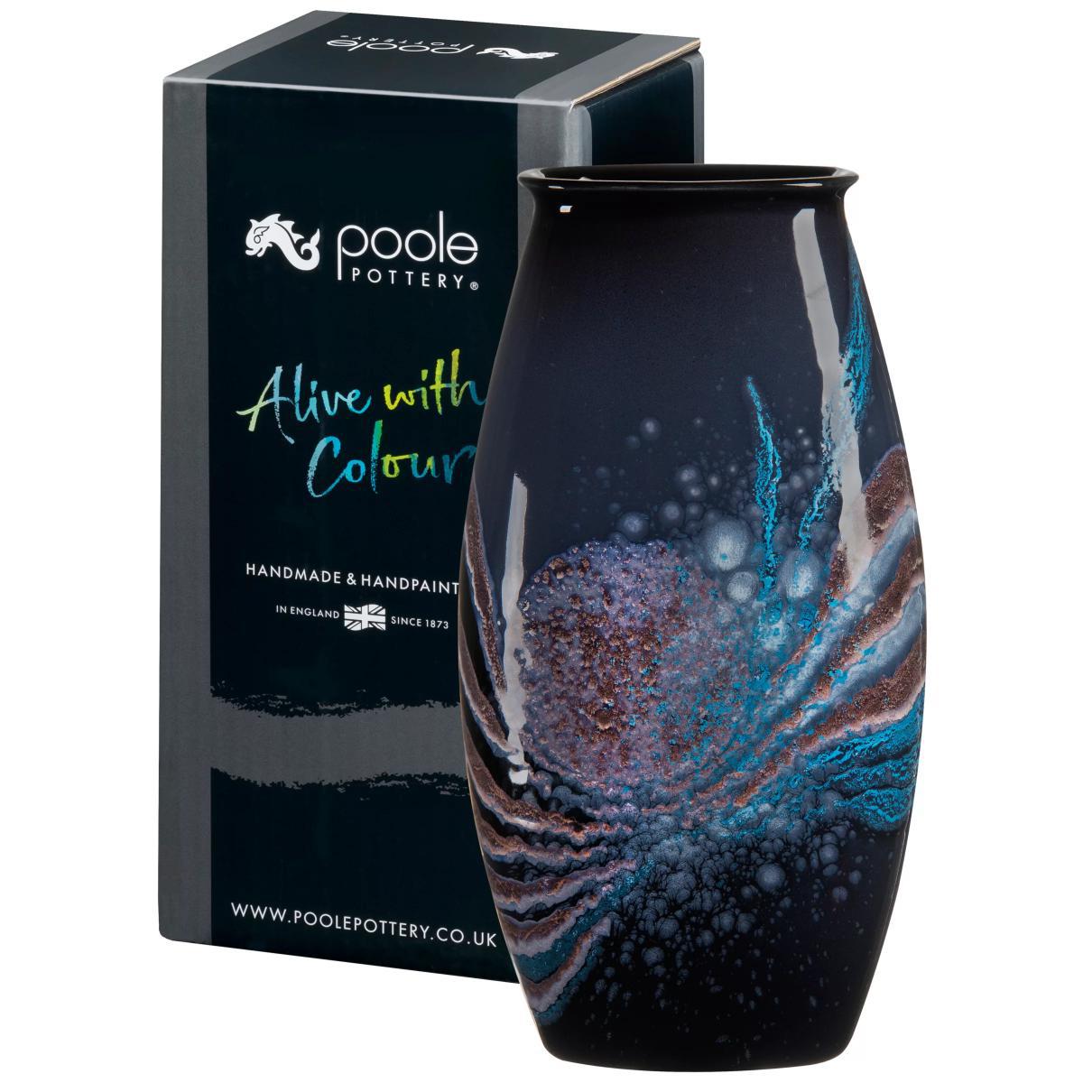 Made in the UK Combining a contrasting and contemporary print influenced by the movement of a celestial body, this eye-catching Manhattan Vase is a wonder to behold. Ideal as a stand-alone decorative piece or for presenting a freshly-cut spring bouquet, this Manhattan Vase is cast by hand and attractively glazed with layers of celestial vapours. Displaying the extraordinary, distinctive effects that Poole is renowned for, this Celestial Manhattan Vase is charmingly packaged in a Poole Pottery gift box and makes a splendid gift for any pottery enthusiasts. The Celestial Manhattan Vase at a glance: Cast by hand from English earthenware clay Glazed in multiple, reactive layers that continue to develop as the piece matures Personalised with the artist's own individual mark Beautifully presented in a stylish Poole Pottery gift box