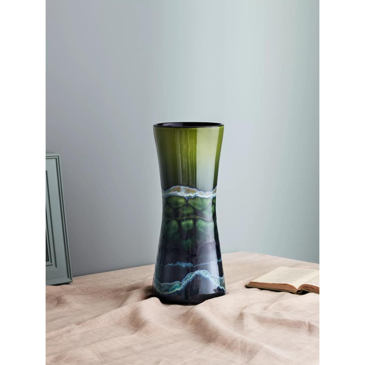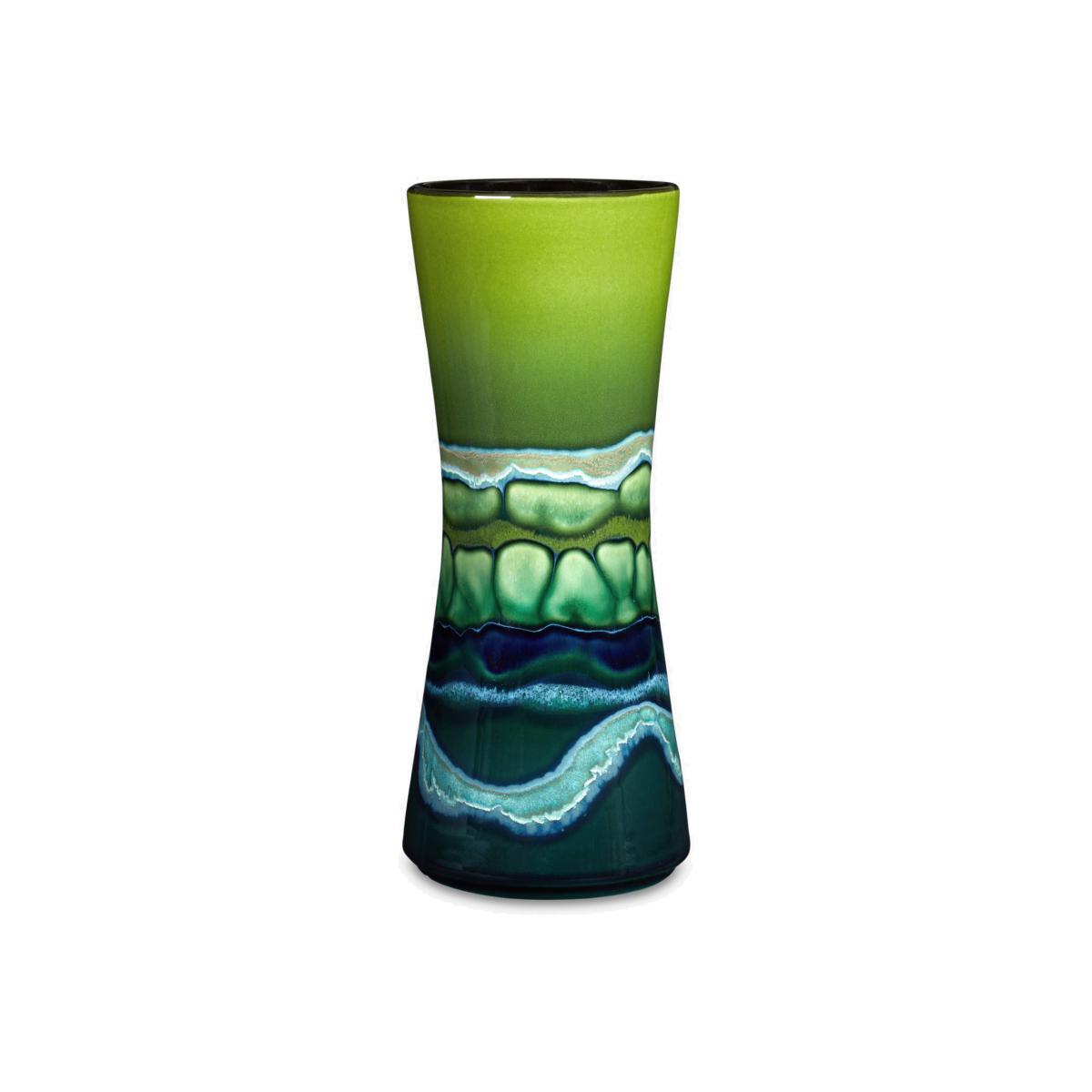 Made in the UK Combining a vibrant mix of electric blue and green glazes this Poole Pottery Maya vase has a tall, hourglass shape, perfect for displaying bouquets. Each item from Poole Pottery is crafted using traditional techniques. The coloured base glaze is first sprayed on by hand and left to dry. A pattern may then be drawn on as a guide if needed before it's handpainted by layering one colour onto another. This creates the shimmering and dramatic effects that Poole Pottery has been known for since 1873. As each piece is decorated by hand every one will be unique.