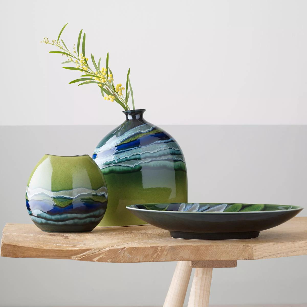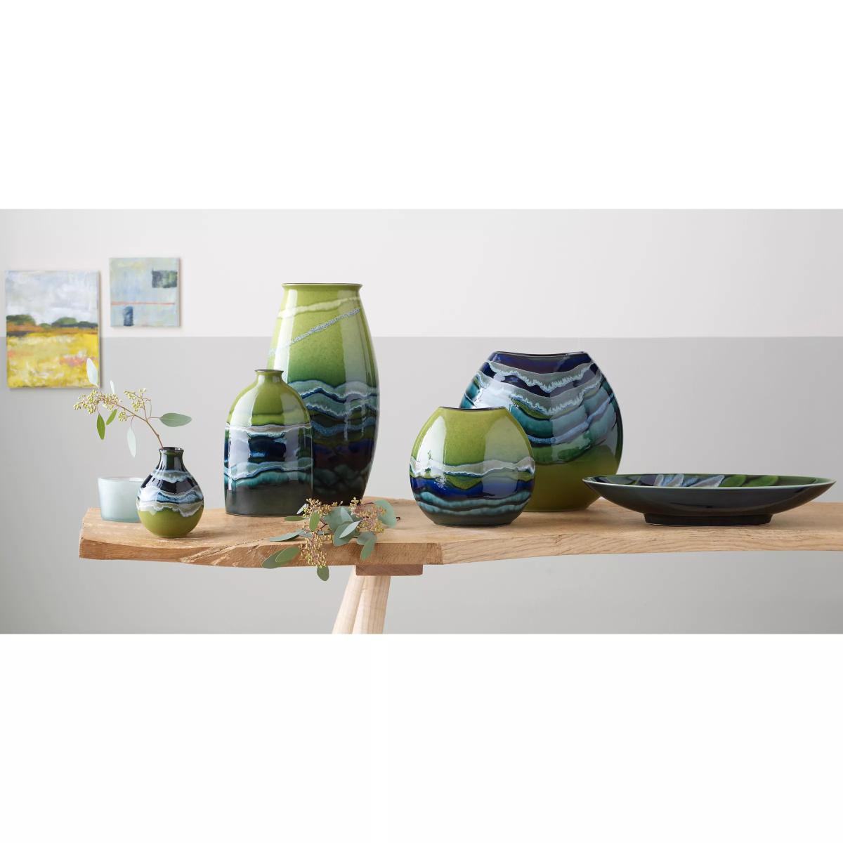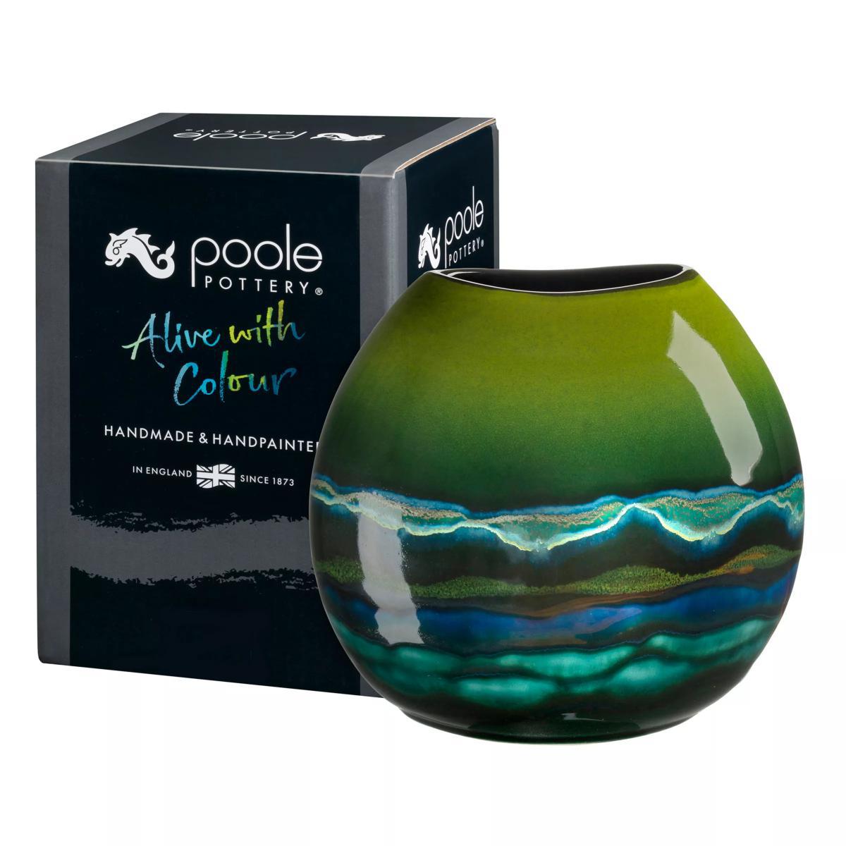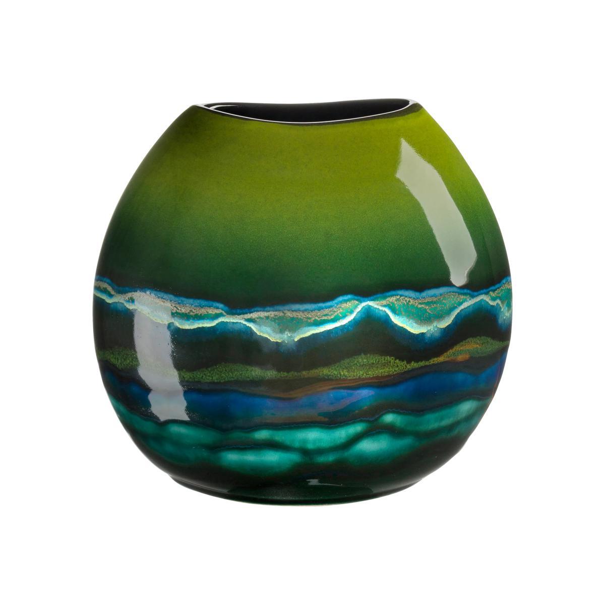 Made in the UK Dressed in layer upon layer of rich blue and green glazes, this dramatic Purse Vase from our Maya collection offers a snapshot of the great British landscape, and will complement both traditional and contemporary interiors alike. There's nothing quite like a blooming bouquet to add a splash of colour to a room, and this eye-catching Purse Vase is perfect for showcasing large blossoms and greenery in style. Featuring Poole's signature Living Glaze effects that continue to develop as the piece matures, this Maya Purse Vase is beautifully presented in a Poole Pottery gift box - ideal for gift-giving any time of year. The Maya Purse Vase at a glance: Cast by hand from English earthenware clay Glazed in multiple, reactive layers that continue to develop as the piece matures Personalised with the artists own individual mark Beautifully presented in a stylish Poole Pottery gift box