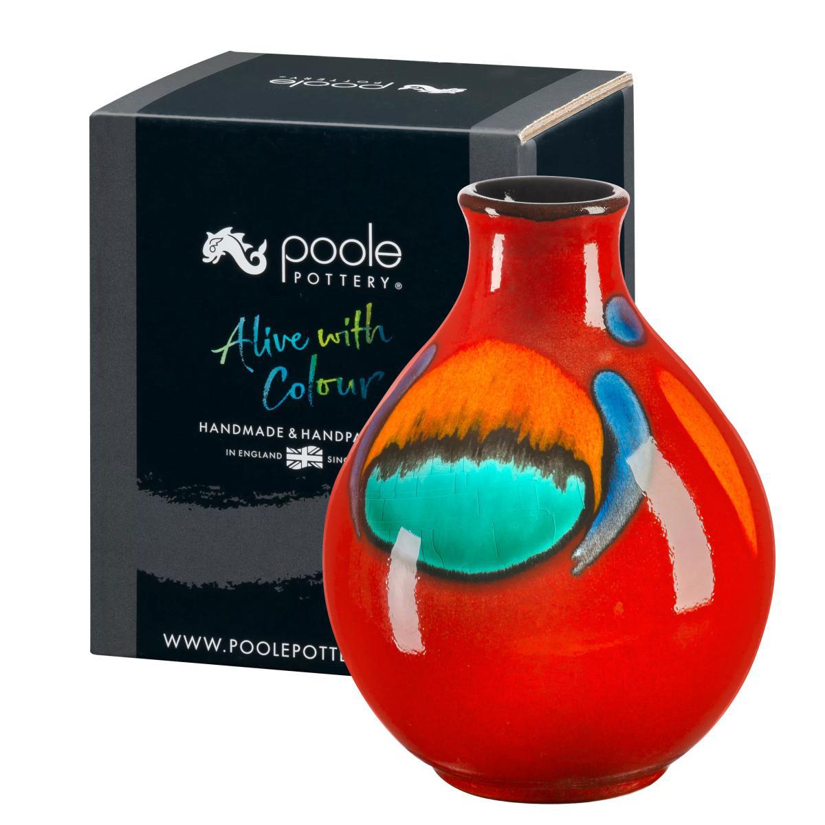 Made in the UK Featuring a collision of strong glazes that melt and fuse similar to lava over cold stone, this dramatic Bud Vase from our Volcano collection is guaranteed to add a striking splash of colour to any interior. Dramatic in colour and style, this Bud Vase is cast and glazed by hand and displays the sensational effects that make every Poole item unique. Attractively presented in a Poole Pottery gift box, this Volcano Bud Vase is certain to please pottery collectors and nature enthusiasts alike. The Volcano Bud Vase at a glance: Cast by hand from English earthenware clay Glazed in multiple, reactive layers that continue to develop as the piece matures Personalised with the artist0s own individual mark Beautifully presented in a stylish Poole Pottery gift box