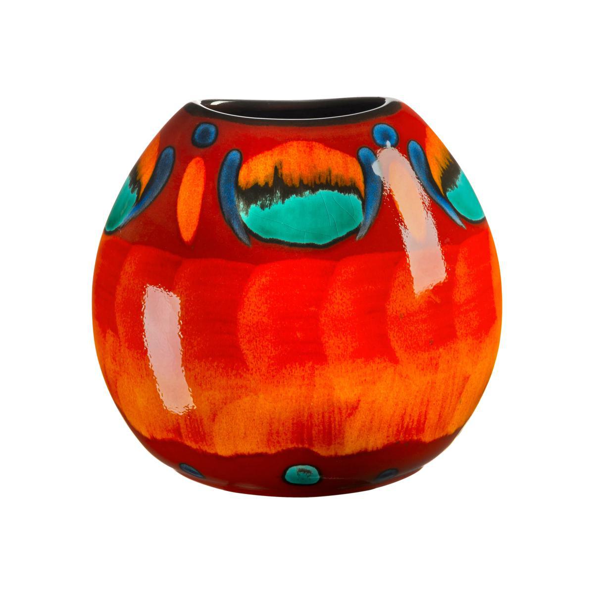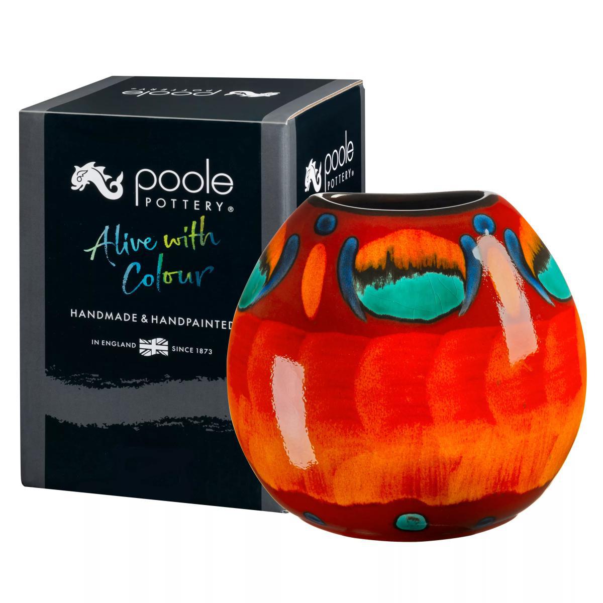 Made in the UK Painted by hand in a dramatic mix of electric blues and molten reds, this striking Volcano Purse Vase features the distinctive glaze effects that make our pottery truly unique. Dressed in vibrant layers of reactive glazes that continue to develop as the piece matures, this classic Purse Vase will complement a whole host of interiors. Designed with a wide rim to give flowers and foliage the freedom to look their best, this Volcano Purse Vase is stylishly presented in a Poole Pottery gift box, making it the perfect gift for any occasion. The Volcano Purse Vase at a glance: Cast by hand from English earthenware clay Glazed in multiple, reactive layers that continue to develop as the piece matures Personalised with the artists own individual mark Beautifully presented in a stylish Poole Pottery gift box