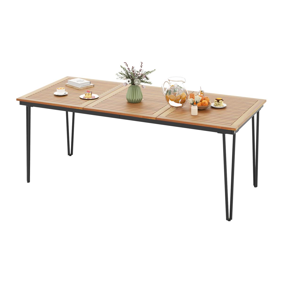 It is suitable for hosting gatherings of up to 8 people while providing a cool shade with its built-in 5cm umbrella hole. Crafted from durable acacia wood, our dining table features a stylish slatted design that allows rainwater to effortlessly drain during outdoor use. Its robust metal frame, complete with strong legs, metal crossbars, and triangle support, ensures exceptional stability and a weight capacity of up to 165 lbs. Whether placed indoors or outdoors, our patio table remains steady on any surface thanks to its adjustable foot pads.