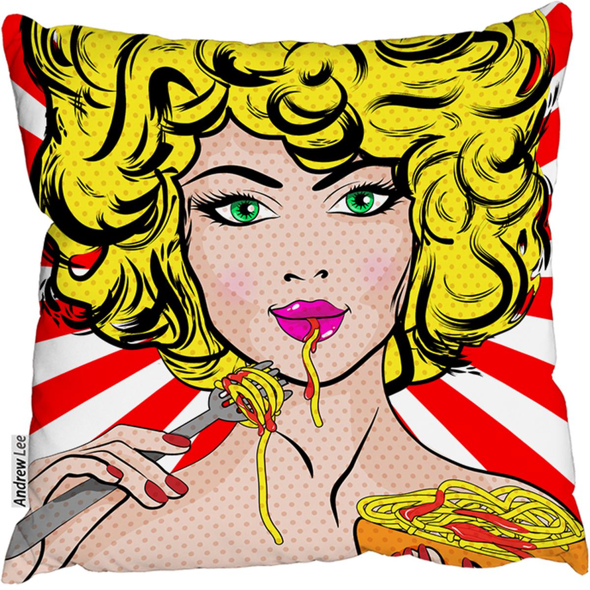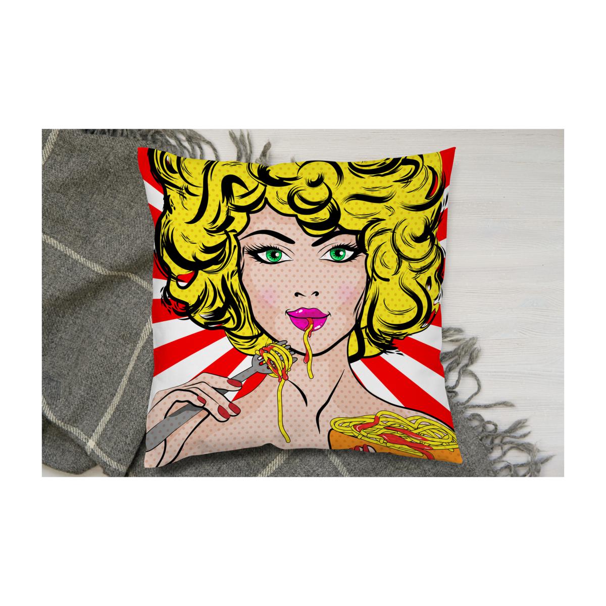 Pop Art Young Woman Eating Spaghetti Cushion - Red / 60