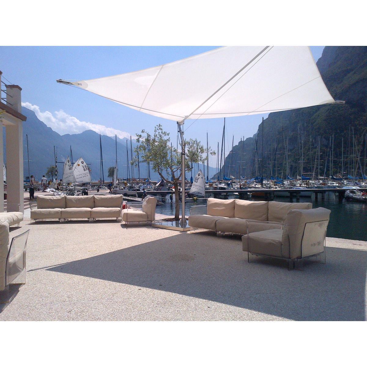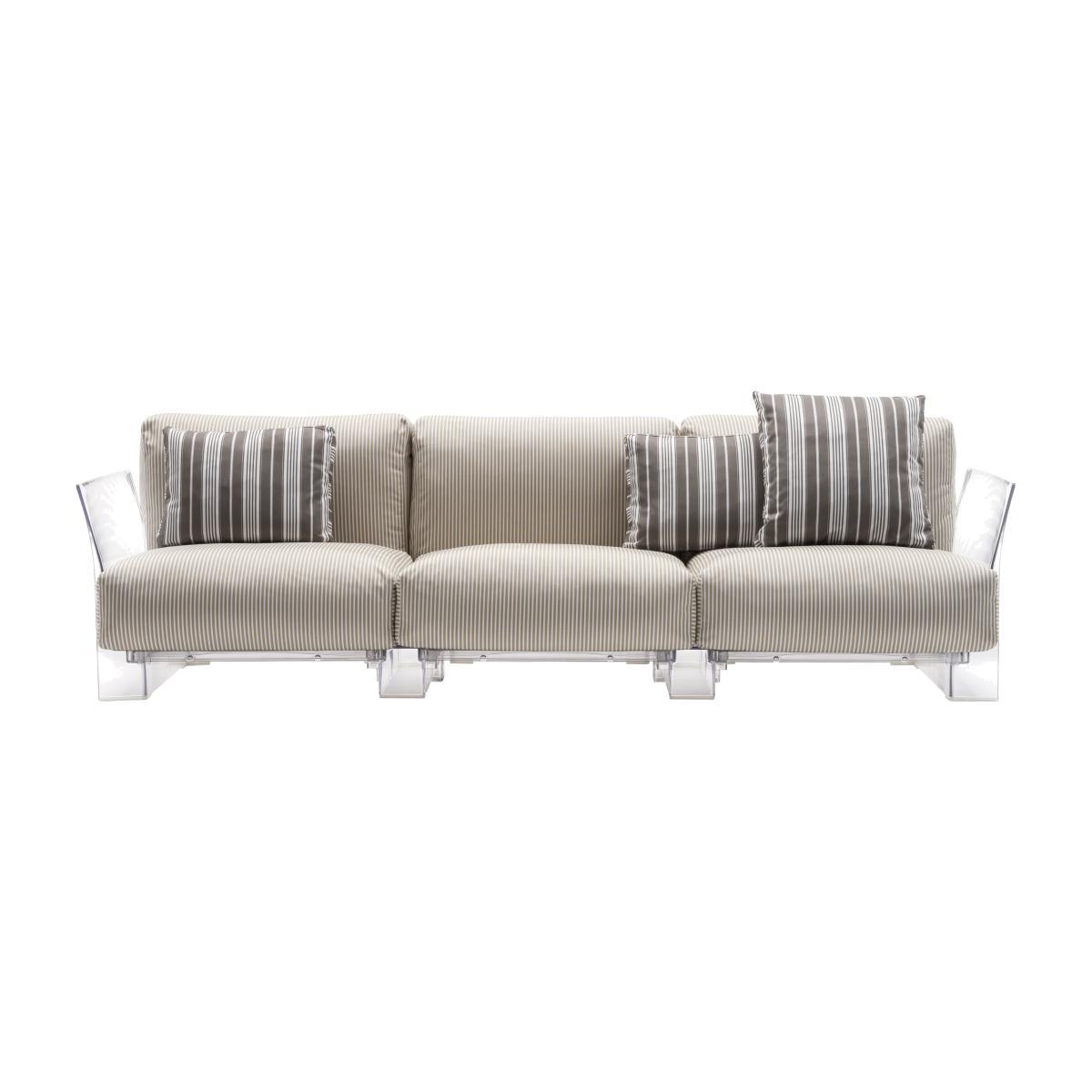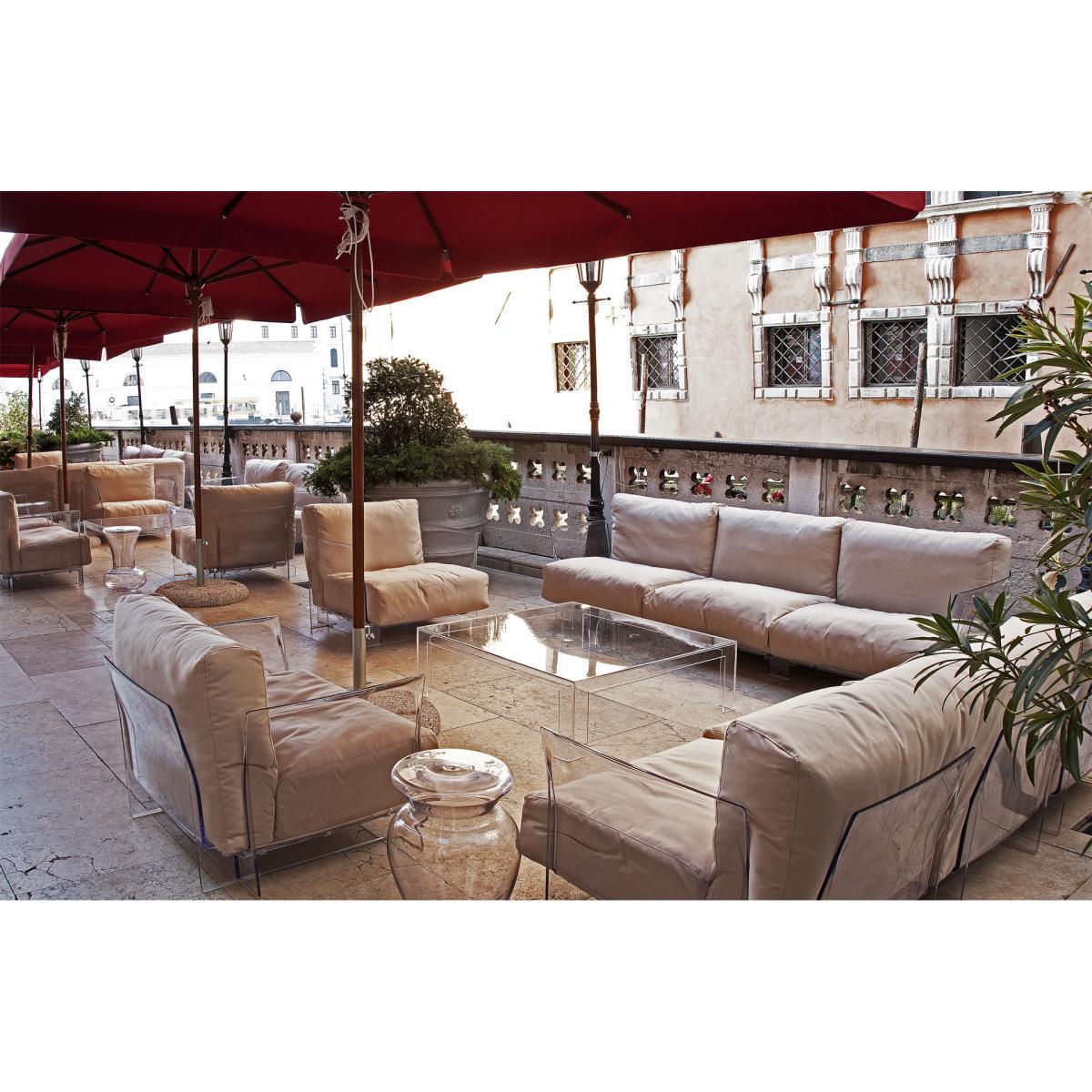 Elegance and comfort for a 100% Italian style garden living room! Signed Piero Lissoni, the Pop Outdoor sofa glamorously combines the modernity of transparent plastic structure with the originality of a fluffy seat sporting an excellent high-end range fabric adapted for the exterior. A subtle blend of materials that harmoniously combines softness and stiffness, fullness and transparency. The six large expanded polyurethane cushions are ultra enveloping and guarantee optimal comfort. The seat of the sofa is very deep and allows you to lounge in any position. The fabric is UV light, mould and stain repellent. Removable and machine washable, it is easy to be maintained. BE CAREFUL! The 3 small flying cushions seen in the photo are not included: they are sold separately. The sofas and armchairs from the Pop collection can be indefinitely adjusted: they consist of dissociable seats that are easily assemble to vary the length of the sofa based on your needs (3, 4, 5. Places). The Pop collection is available in many colours and coatings: contact us for more information.