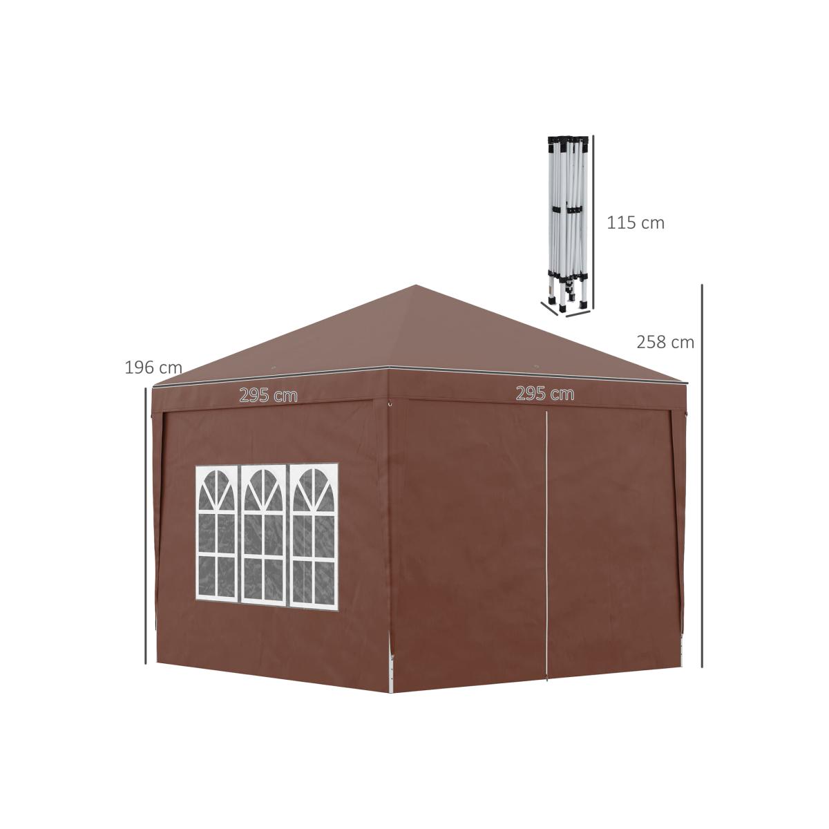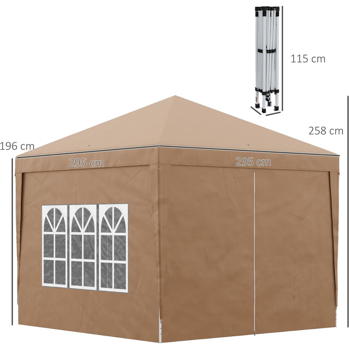 This Outsunny 2.95 x 2.95m gazebo with sides is a great, no-fuss outdoor shelter. It is ideal for family parties, weddings, picnics, sports events, outdoor vendors, craft fairs, job sites and camping trips. The pop-up design makes set-up and take down super easy. It comes with two removable walls: create an open or closed feel, whenever. The powder-coated steel frame means a strong standing structure. Comes with guy ropes and ground stakes to pin to the ground for extra stability.