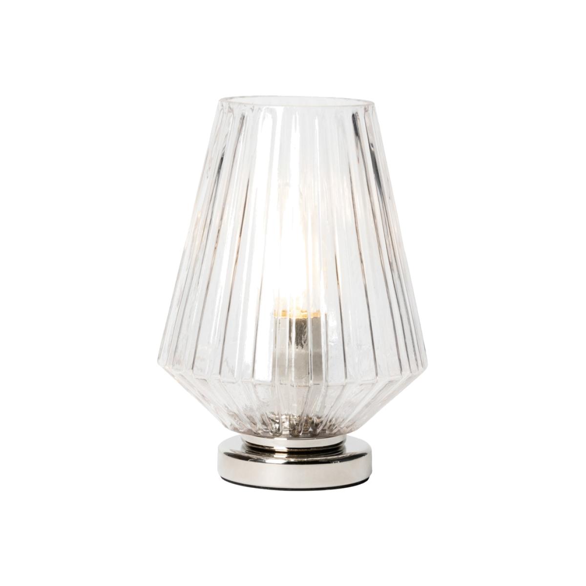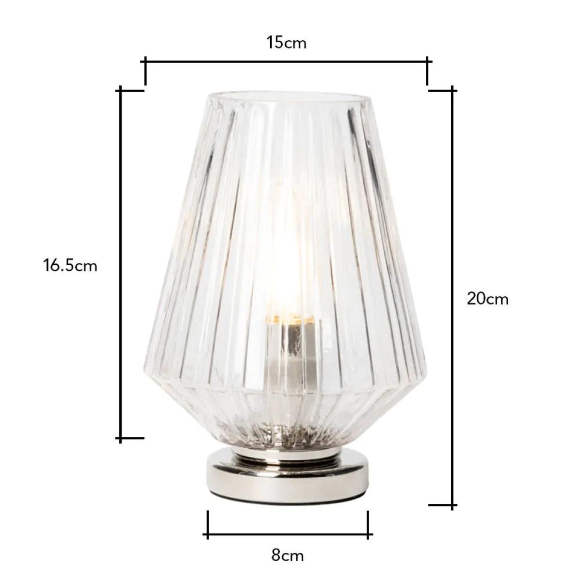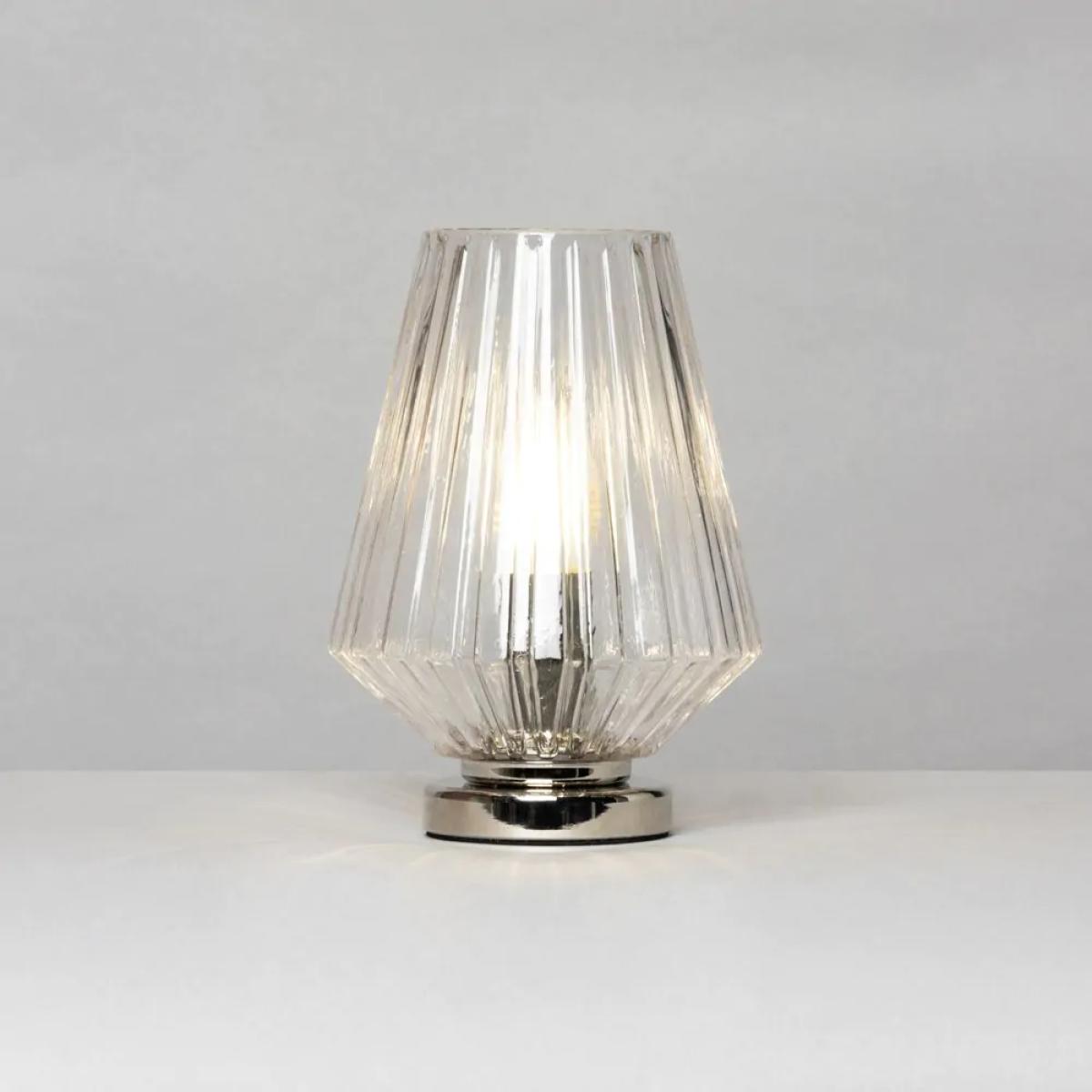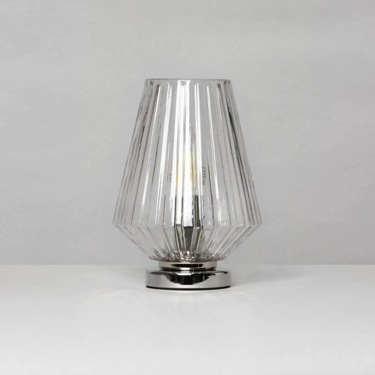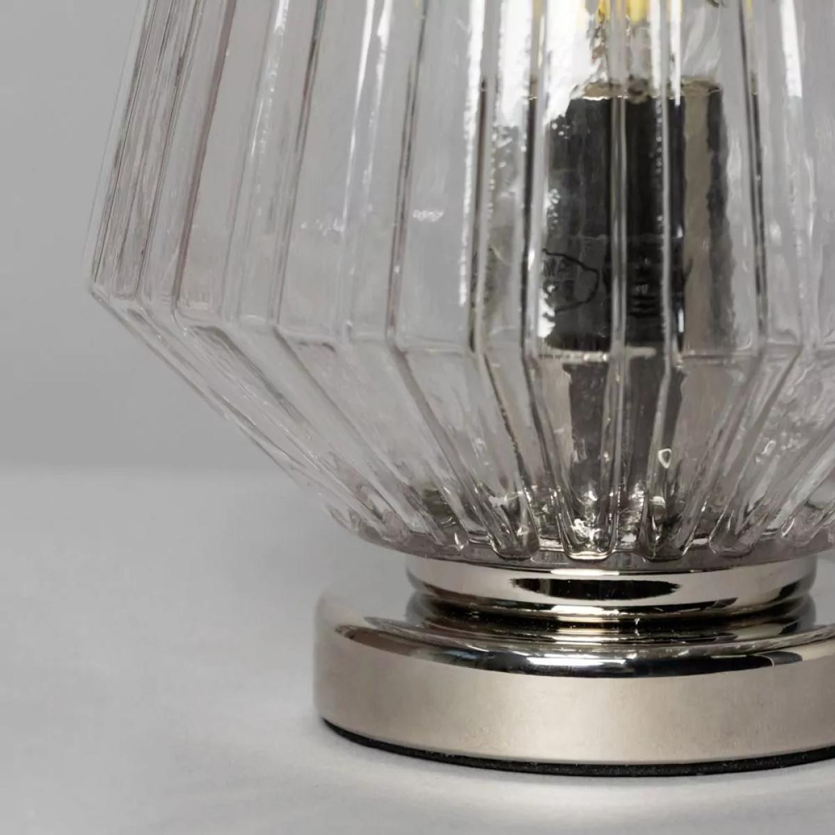 I love this small table lamp with its clear shade and chrome finish because it offers a sleek, contemporary vibe that’s versatile across various interiors. It works particularly well in minimalist, modern, or Scandinavian schemes where clean lines and subtle detailing are key. To style it effectively, try placing it on a side table, sideboard, or bedside table to add a soft, layered glow without overpowering the space. Its transparent shade makes it a good option for showcasing decorative bulbs or smaller accessories nearby. For a balanced look, pair it with textured fabrics or matte finishes to contrast with its shiny chrome and glass, creating an inviting yet polished environment.