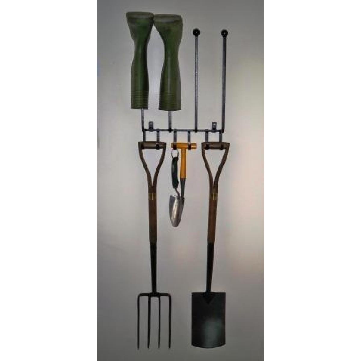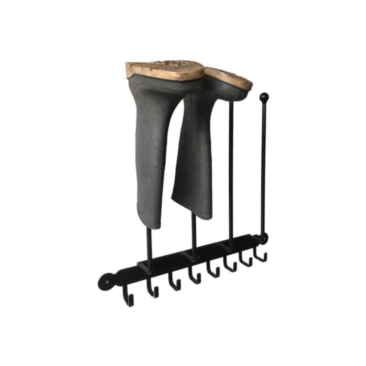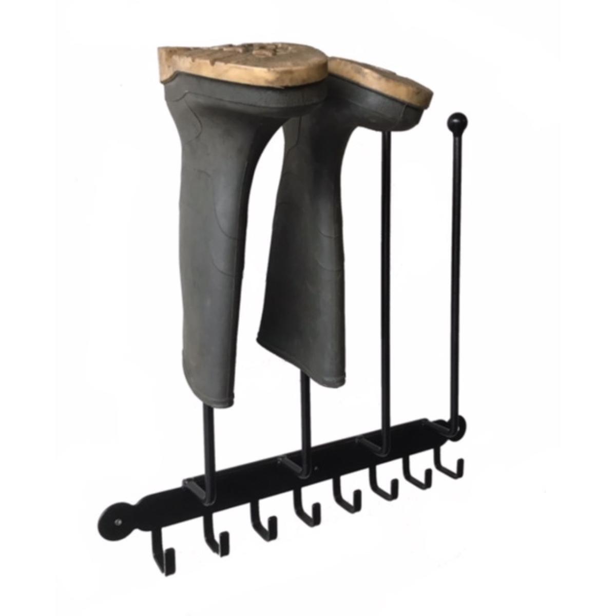 The Wall Fixing 2 Pair Boot Rack by Poppy Forge is perfect for anyone who regularly returns home wearing wet and muddy boots and with its handy hooks below it is great for hanging dog leads, outdoor coats or even garden tools. Suitable for a garage or shed it is a tidy storage solution for wellies, muddy boots, wet trainers, football boots, dog leads, waterproofs, riding or hiking boots or even garden tools. Made from an all steel construction (10mm/12mm) Coated in durable black polyester paint, this boot rack is definitely hardwearing. Designed in England and forged by English craftsmen. Supplied fully assembled.   Dimensions: Height: 53.3cm (21in) Width: 36.8cm (14.5in) Depth: 7.6cm (3in)