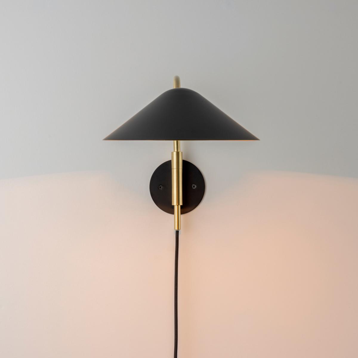 Our Poppy wall lamp with matte black metal triangular shade and brushed gold-brass accents is a stunning wall lamp that will add some serious glam glow to your living room, bedroom, or maybe next to your dining table? The bold colour combination will certainly catch the eye, but it's simple design means it won't overwhelm your space. The Poppy has nods to retro vintage glam lighting styles - the triangular shade and the black-gold combo has some big Art Deco vibes - but it's kept bang up to date with the matte powder-coated finish and minimalist shape. The Poppy wall light will look fab in a range of home styles, from maximalist to minimalist, glam to Industrial. Note that though this is wall-mounted, it has a black corded power cable, on/off rocker switch and plug, and does not require wiring into the mains. Uses 1x 18W E14 bulb (not included). Check out our full lighting range for more ideas.