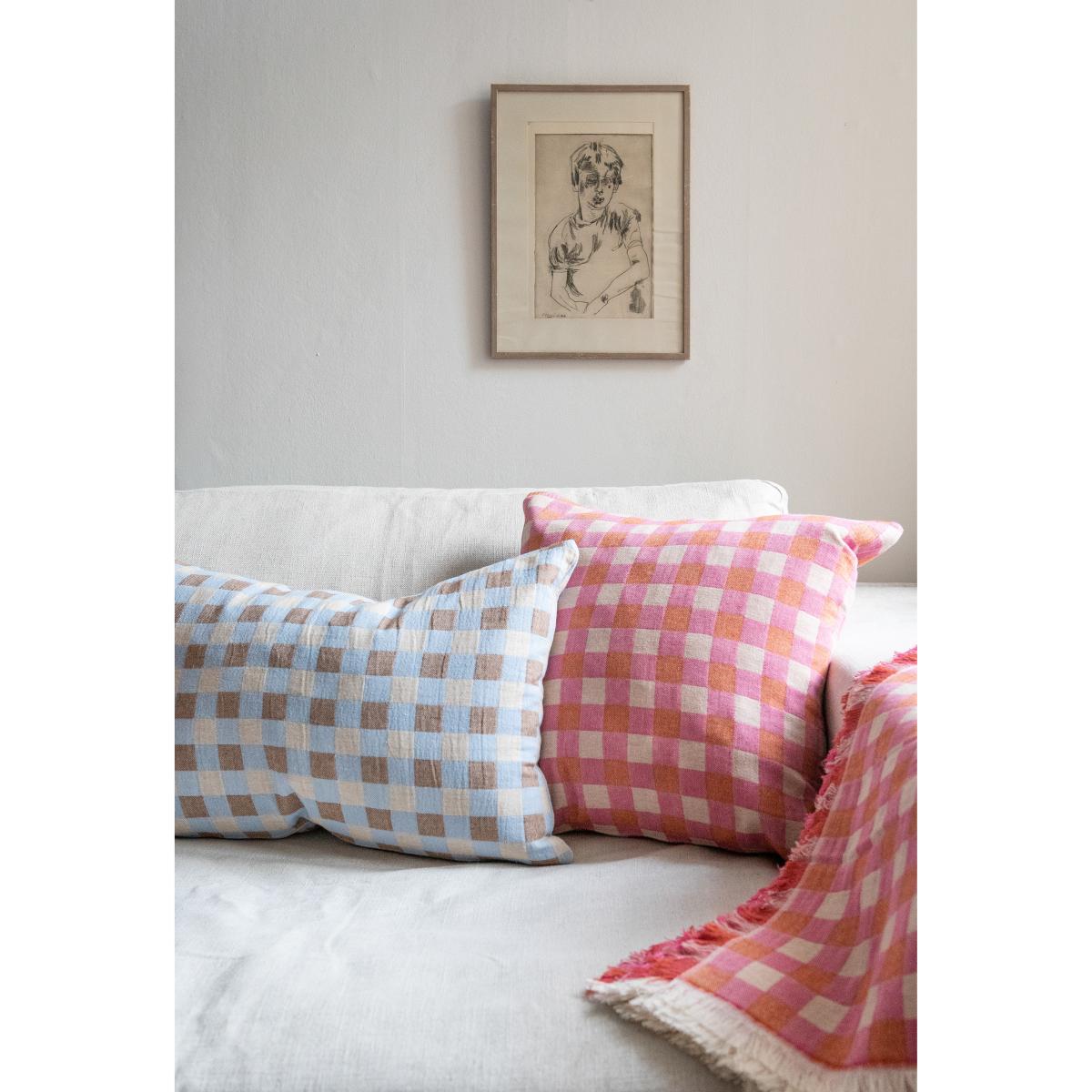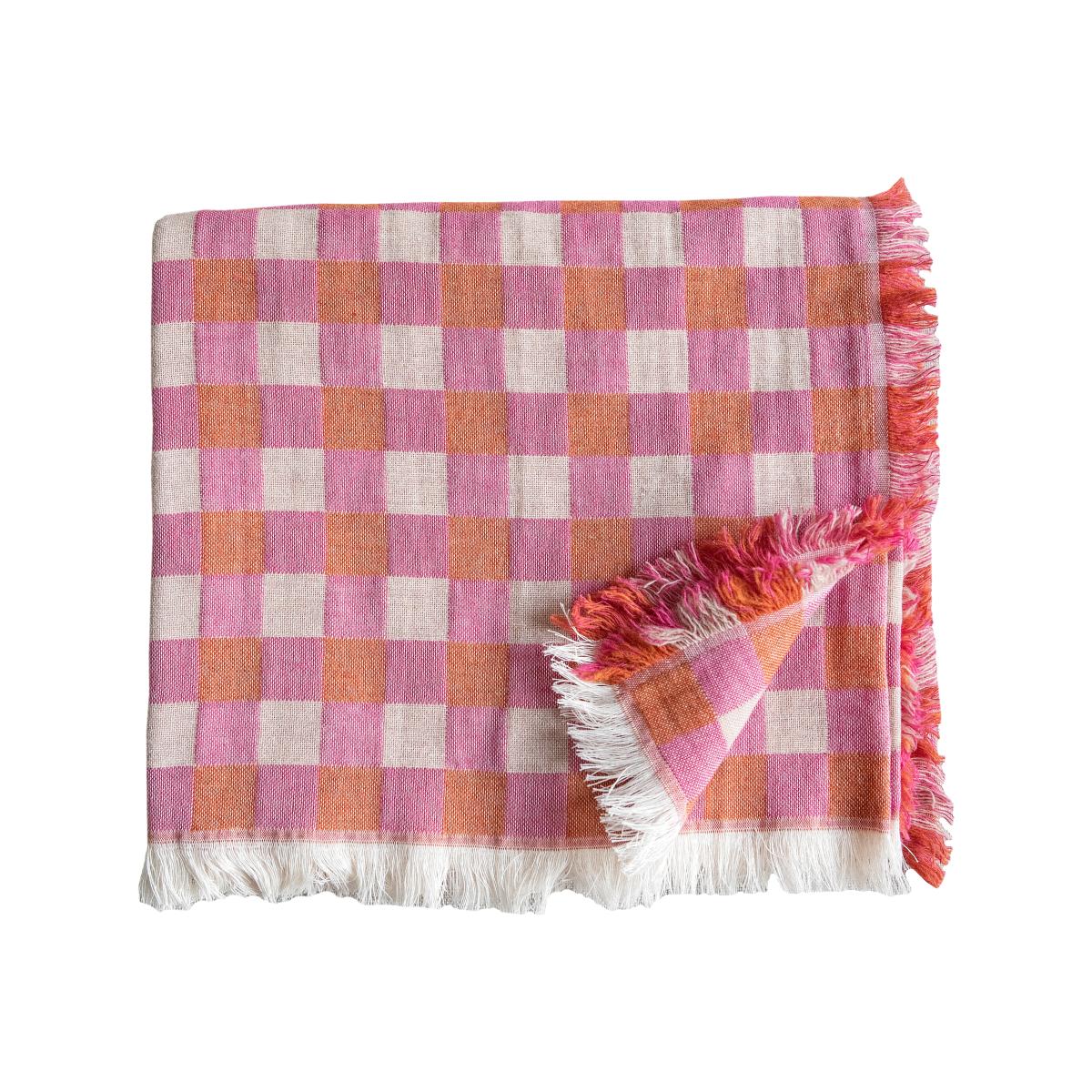 The pink throw works beautifully in both cosy and contemporary interiors, adding a pop of colour while maintaining a soft, inviting feel. I love it layered over a neutral sofa or bed to inject warmth and personality. Its checkered pattern and tactile wool construction lend a relaxed yet refined look, perfect for creating a lived-in, welcoming space. Practical styling tips include draping it casually over a armchair for easy throws or folding it neatly at the end of a bed for a colourful finishing touch. Its versatile size also makes it great for layering with other textiles or using as a standalone accent, making it an accessory that combines function with style effortlessly.