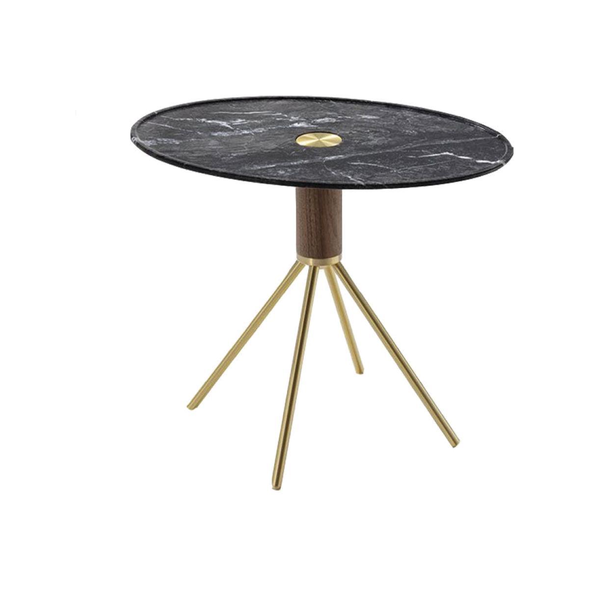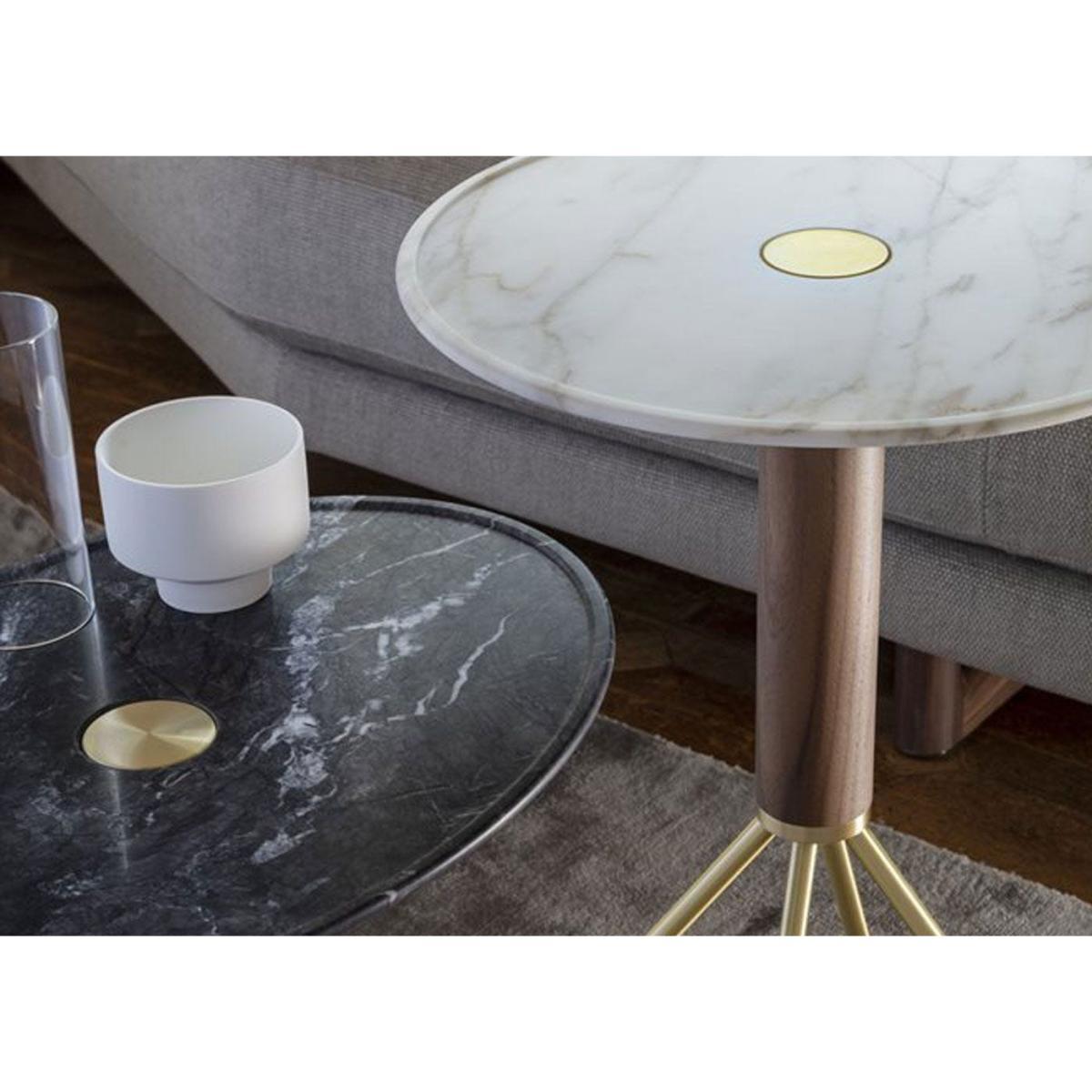 Exuding effortless class, this Jelly Round Side Table speaks to Porada’s reputation for craftsmanship and art-like designs. Made by the renowned Italian luxury furniture brand, this side table combines carefully chosen materials in a luxury form. The round tabletop is made from Carrara White — a white marble with soft grey veins — and topped with a layer of glass. Made from brushed brass are four spoke-like legs that support the cylinder walnut extension, rising to the surface like a telescope. Makes a stunning addition beside a lounge, bed, or in a library.