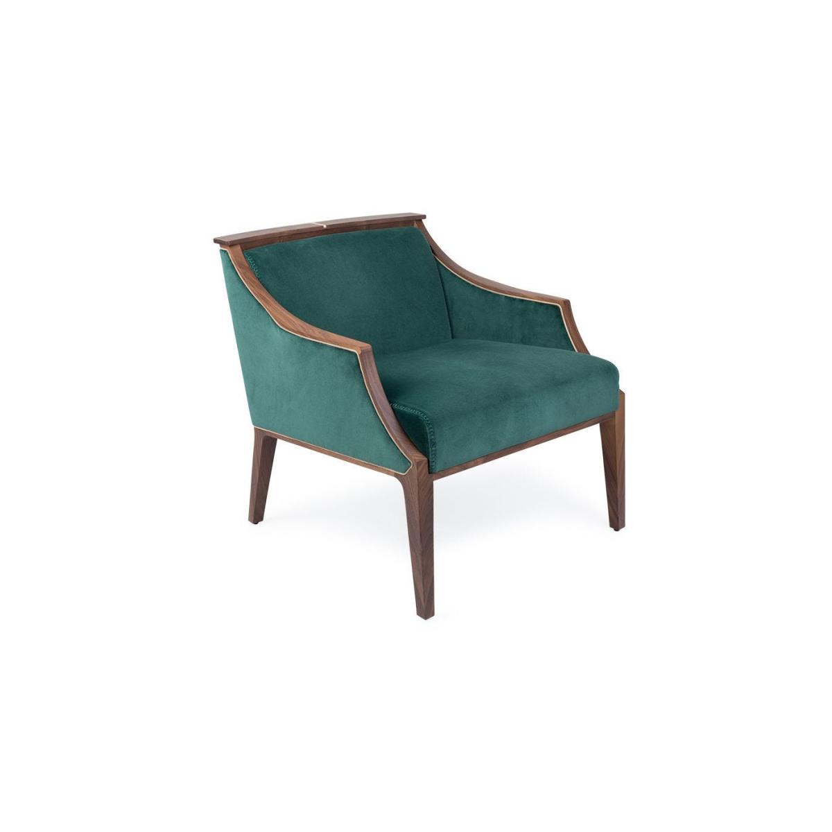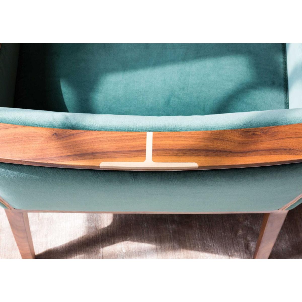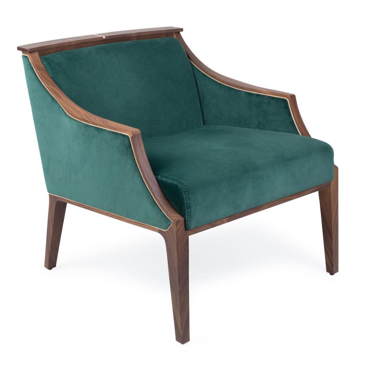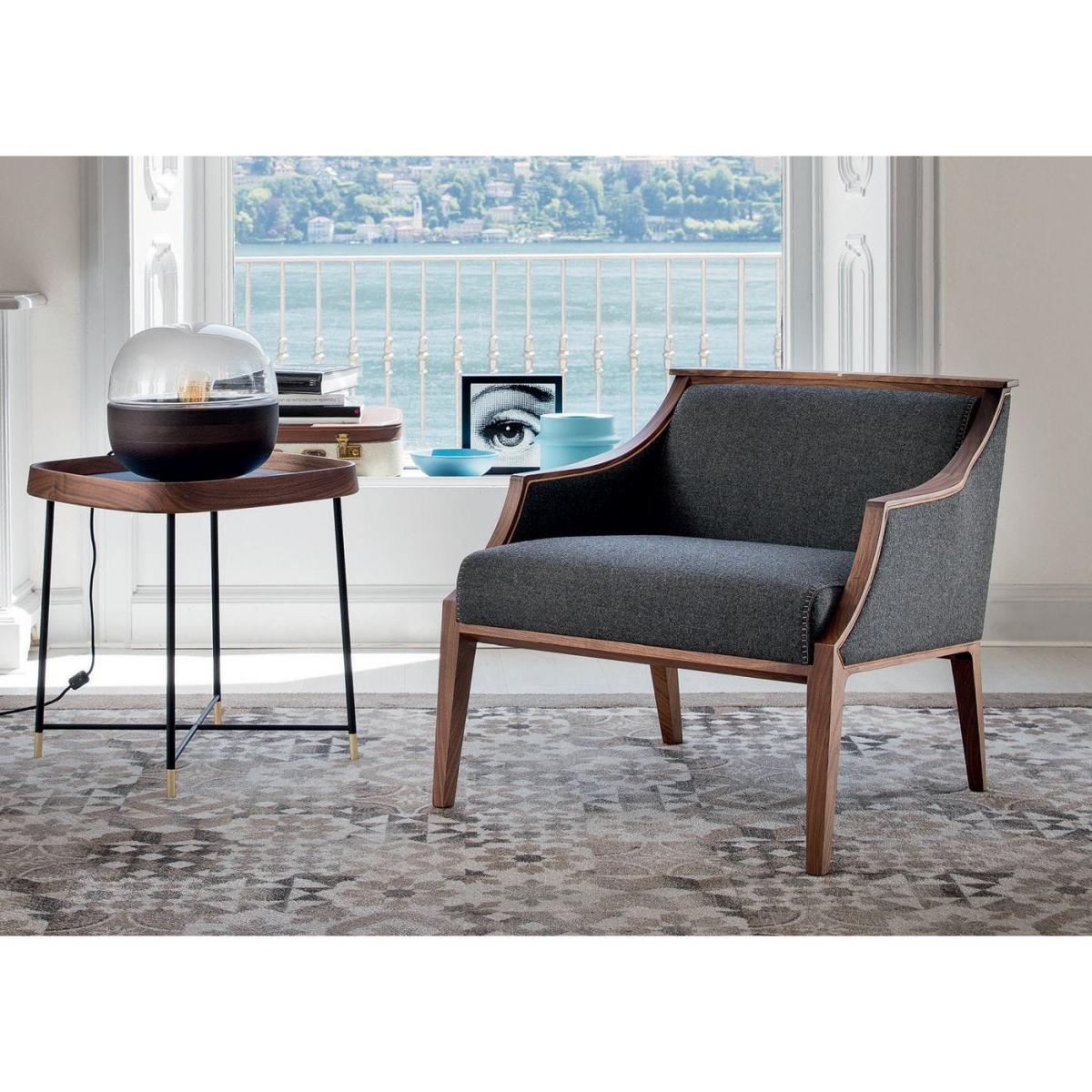 Easy chair with frame in solid Canaletta walnut, cover in the fabrics of the collection and upholstered arms. Solid natural maple insert in the upper part of the frame.