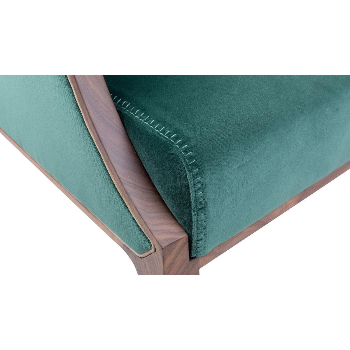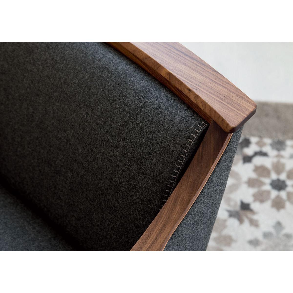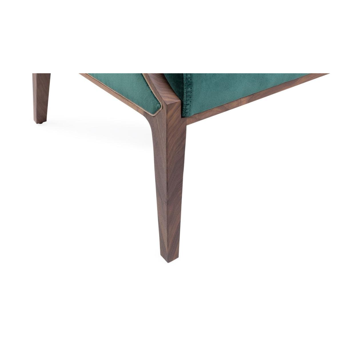 Easy chair with frame in solid Canaletta walnut, cover in the fabrics of the collection and upholstered arms. Solid natural maple insert in the upper part of the frame.