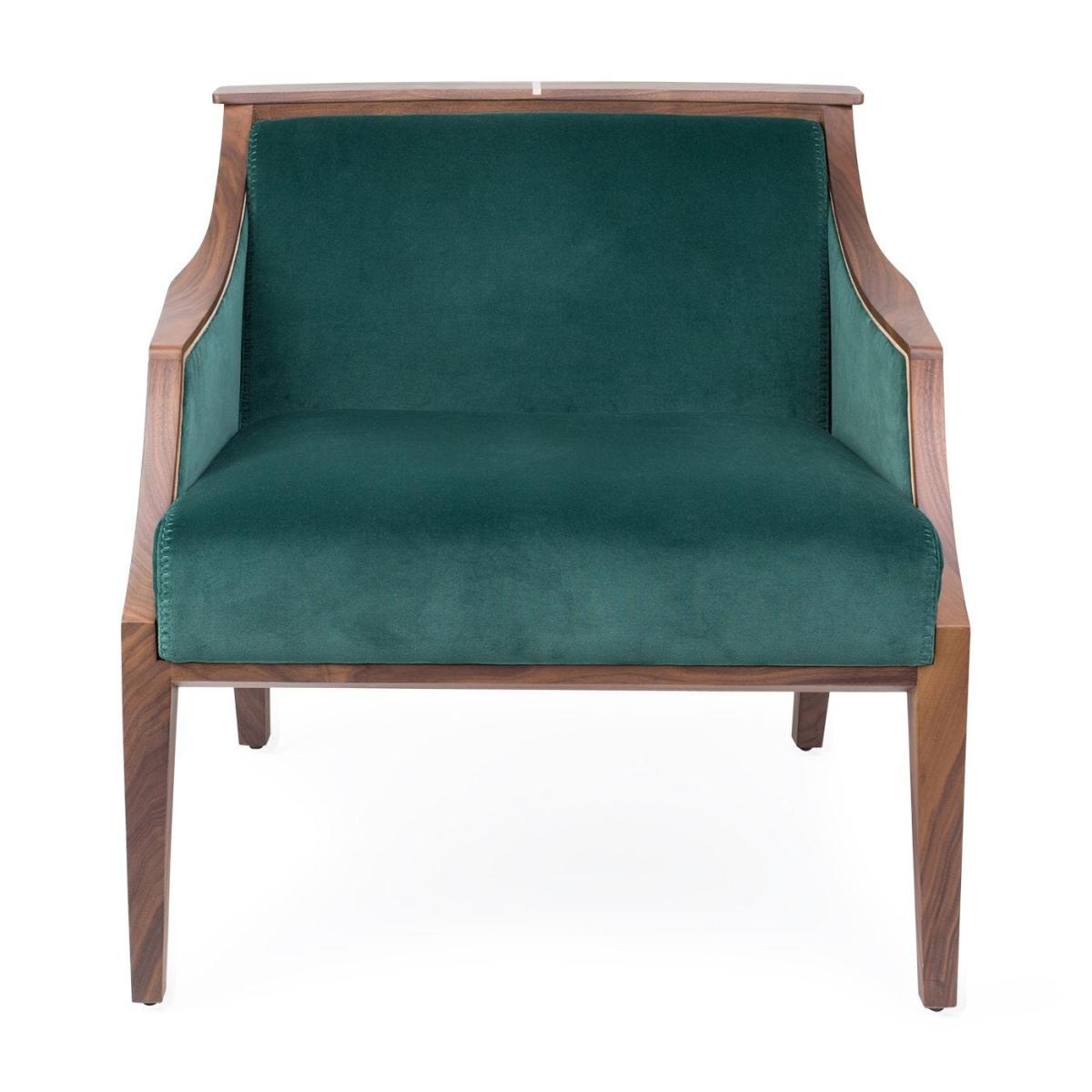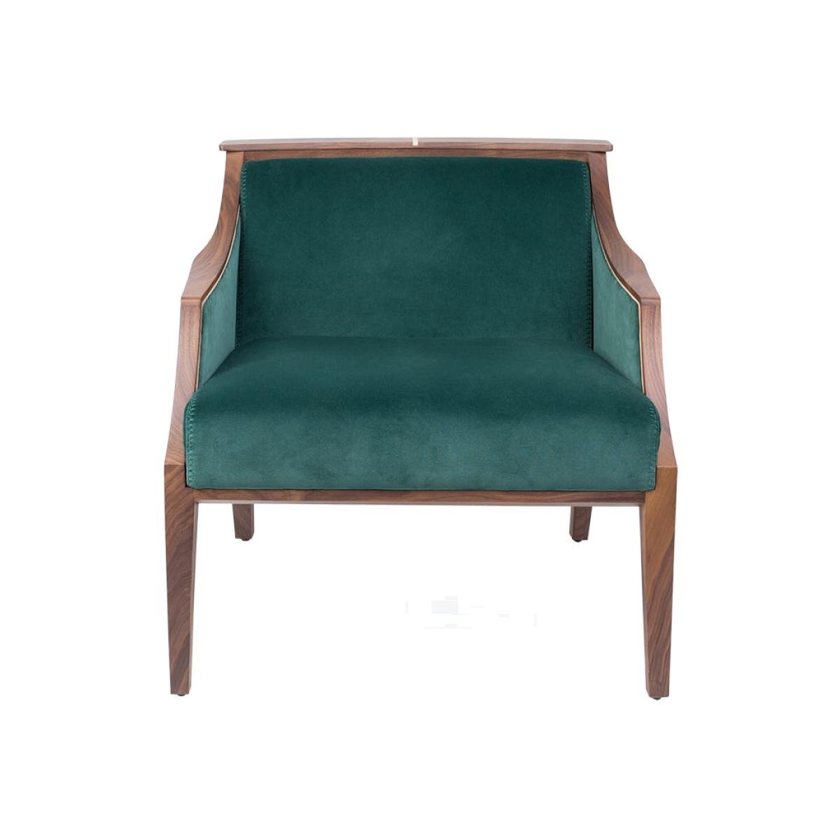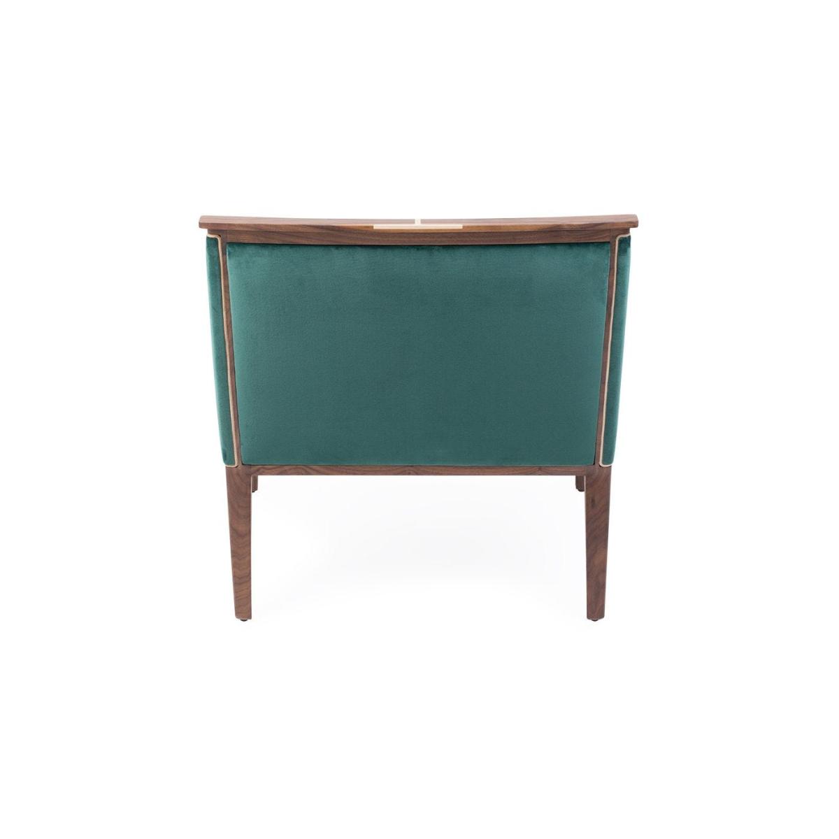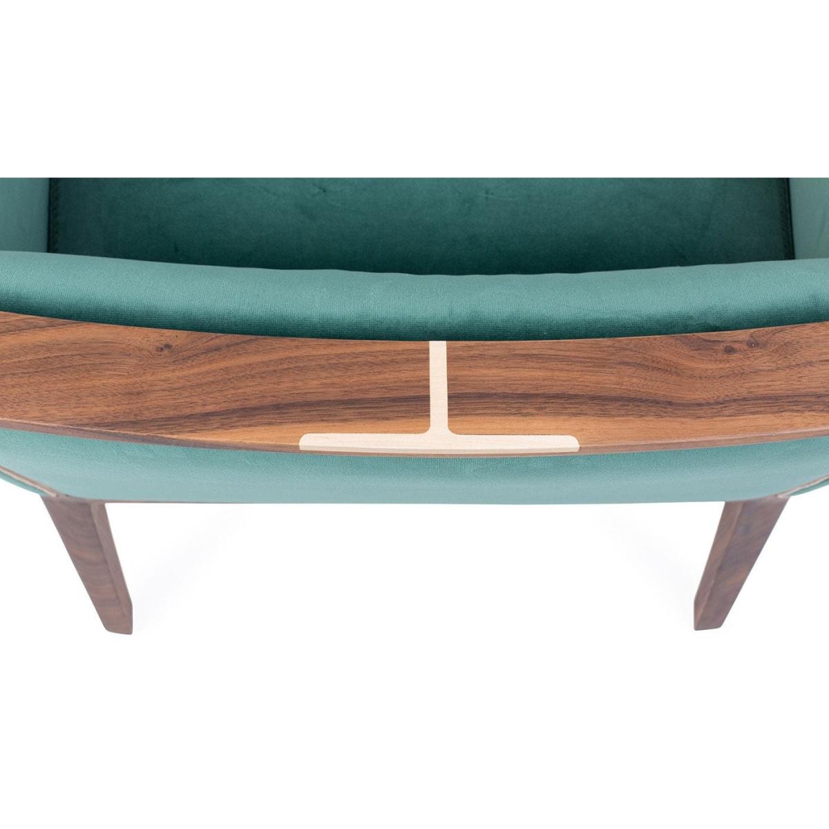 Easy chair with frame in solid Canaletta walnut, cover in the fabrics of the collection and upholstered arms. Solid natural maple insert in the upper part of the frame.