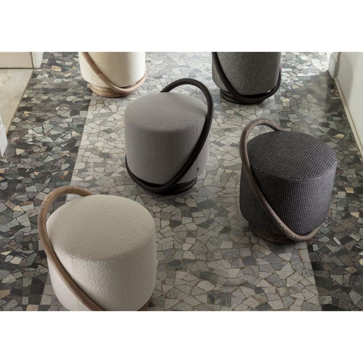 Lending to their reputation of skilled craftsmanship and unique designs, Porada has created a truly special pouffe for any modern home. The slanting wooden halo that acts as a frame is made from beautiful ash wood, matching the circular base of this compact Smile pouffe. The richness of the ash combines idyllically with the cylindrical cushion that makes the heart of this piece. Crafted from a dark motley fabric, the upholstery of this seat only adds to its luxurious comfort.