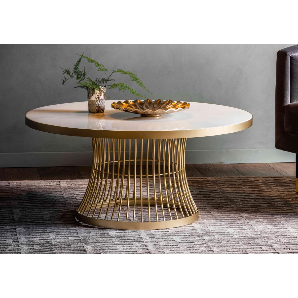 This beautiful coffee table is available in bronze and champagne, each featuring a unique tabletop but both offering high-end looks. Why you'll love it This table’s unique design is perfect for a living room centrepiece. On-trend cage-style frame base brings the wow factor. Bronze base features an inlaid tinted glass top. Champagne base has a stunning white marble top. What you need to know Made from glass or marble, metal and MDF. We recommend always using coasters. For indoor use only. Dimensions Width: 90 cm (36 inches) Height: 42 cm (17 inches) Depth: 90 cm (36 inches) Weight:Bronze 20.7 kg, Champagne 41.7 kg