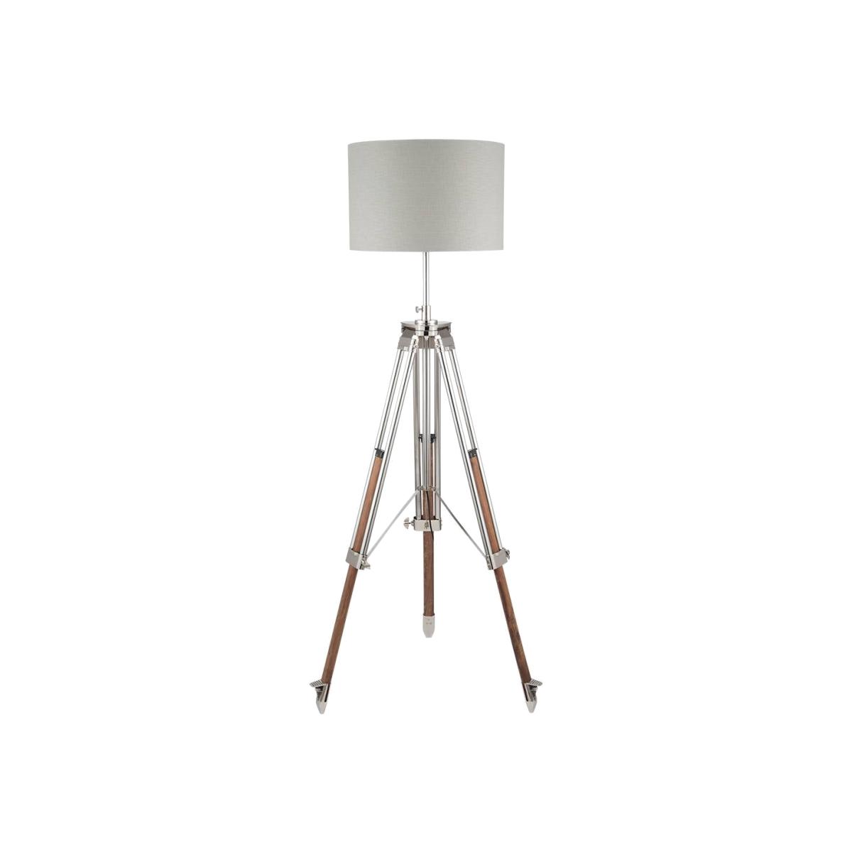 Modern floor lamp boasting a wooden finish, complete with a grey lamp shade.. A striking addition to your home, this tripod floor lamp is part of the Port range from Pagazzi Lighting. Boasting oak wooden legs with nickel-metal detailing throughout, this height-adjustable piece has been paired with a grey linen shade. It is perfect for use in all living areas, including lounges, hallways and bedrooms.. Style this light with one of our vast selection of LED E27 light bulbs