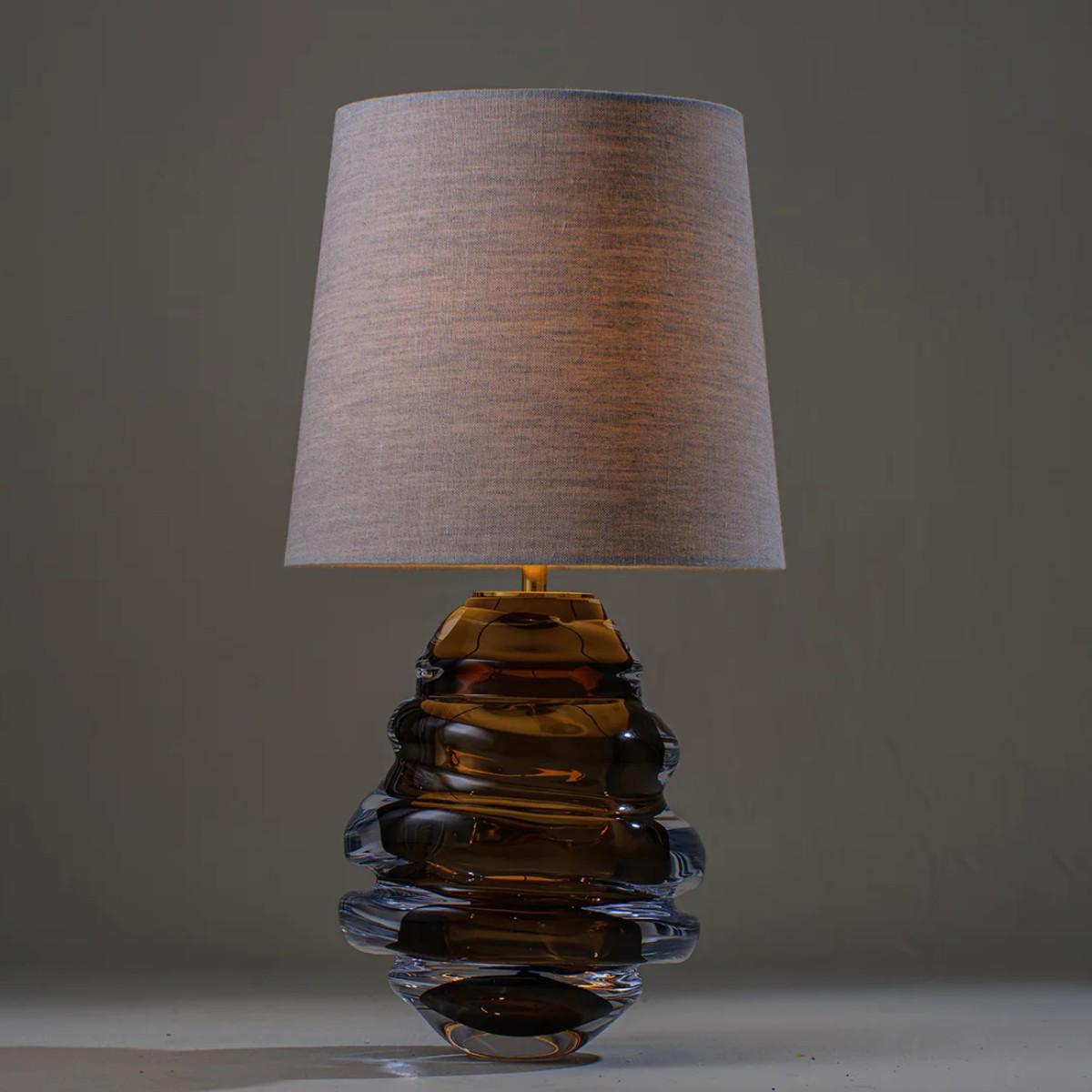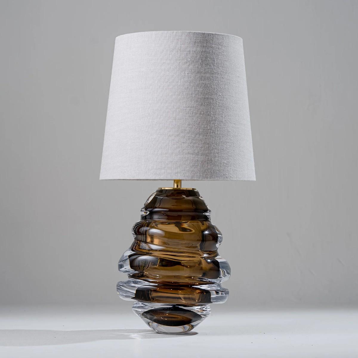 The Briony lamp is made from handblown glass. The centre, coloured in either Charcoal, Cedar, Moth or Clear is then encapsulated in thickly layered rich folds of clear glass, to create an even greater sense of depth. Cedar shown with 11" Bongo in Natural Linen with Cream Card lining. Many Porta Romana pieces are fully customisable. Products can be scaled up or down, proportions can be changed, and designs can be painted to your choice. Please contact us for options and best pricing.